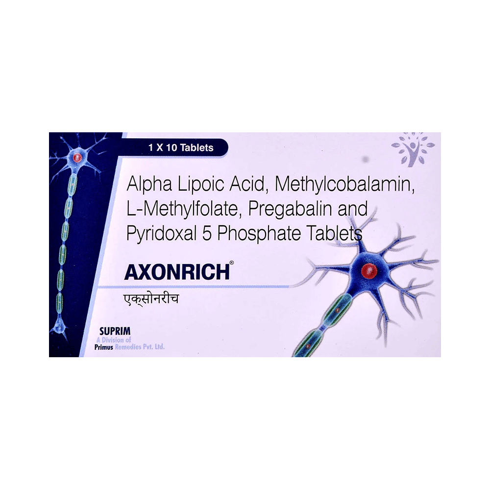 Axonrich Tablet is a combination medicine used to treat neuropathic pain. It works by protecting the nerve fibers against damage, repairing the damaged nerves, thereby relieving the pain sensation. Axonrich Tablet may be taken with or without food. However, it is advised to take it at the same time each day as this helps to maintain a consistent level of medicine in the body. Take this medicine in the dose and duration advised by your doctor. If you miss a dose of this medicine, take it as soon as you remember. Finish the full course of the treatment even if you feel better. It is important not to stop taking this medicine suddenly.Some common side effects of this medicine include tiredness and uncoordinated body movements. It may also cause dizziness and sleepiness, so do not drive or do anything that requires mental focus until you know how this medicine affects you. However, these are temporary and usually resolve on their own. Please consult your doctor if these do not subside or bother you.You should avoid alcohol while taking Axonrich Tablet, as it may worsen certain side effects. This medicine can also lead to weight gain, eat a healthy balanced diet, avoid snacking with high-calorie food, and exercise regularly. Inform your doctor if you develop any unusual changes in mood or behavior, new or worsening depression, or suicidal thoughts or behavior.