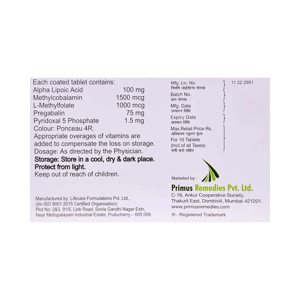 Salt Composition: Alpha Lipoic Acid (100mg) + L-Methyl Folate Calcium (1000mcg) + Methylcobalamin (1050mcg) + Pregabalin (75mg) + Pyridoxal-5-phosphate (1.5mg)