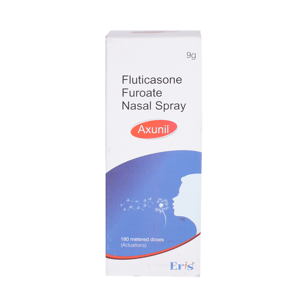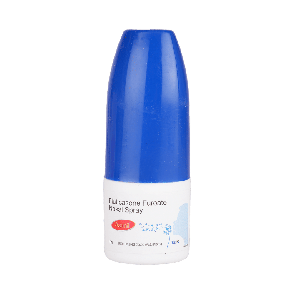In Treatment of Sneezing and runny nose due to allergiesAxunil Nasal Spray belongs to a group of medicines called corticosteroids. When it is sprayed into your nose it will reduce swelling and irritation and relieve symptoms such as blocked or stuffy nose, sneezing, and itchy or watery eyes. It is less likely than some other medicines to cause high blood pressure or changes in your sodium or potassium levels. This medicine works in your nose to block the effects of substances like pollen, dust mites, and mould that can trigger allergic reactions. This will make it easier for you to go about your daily activities without worrying so much about getting an allergic reaction. It may not work straight away, so use it regularly as prescribed to get the most benefit. If you see no improvement after a week, talk to your doctor.