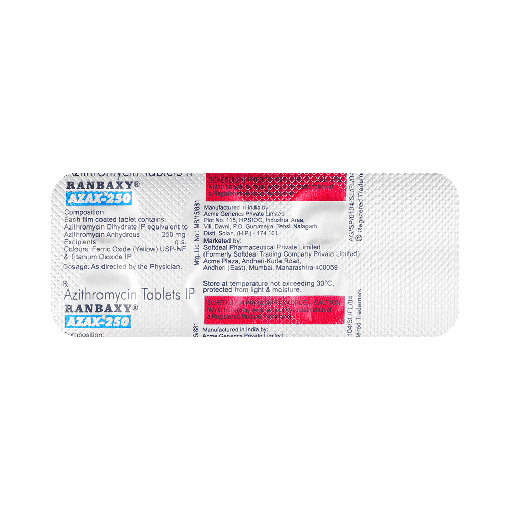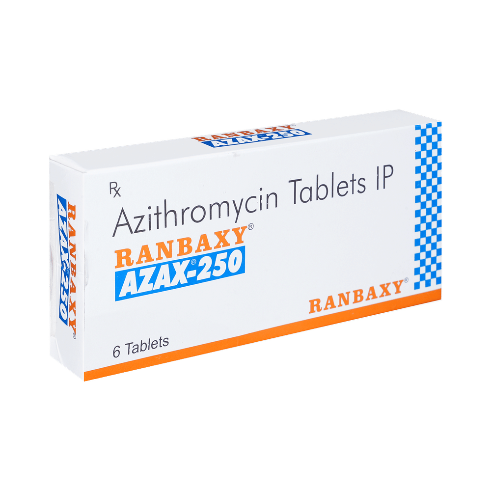 Azax 250 Tablet is an antibiotic used to treat various types of bacterial infections of the respiratory tract, ear, nose, throat, lungs, skin, and eye in adults and children. It is also effective in typhoid fever and some sexually transmitted diseases like gonorrhea. Azax 250 Tablet can be taken with or without food. Take it regularly and at a fixed time. Do not skip any doses and finish the full course of treatment even if you feel better. Stopping the medicine too early may lead to the return or worsening of the infection.Common side effects seen with Azax 250 Tablet include diarrhea, vomiting, nausea, and stomach pain. These are usually temporary and subside with the completion of treatment. Consult your doctor if you find these side effects worry you or persist for a longer duration.Do not use Azax 250 Tablet if you have a history of cholestatic jaundice or hepatic dysfunction that can be worsened with the use of Azax 250 Tablet. Inform your doctor if you have any previous history of allergy or heart problems before taking this medicine. Pregnant or breastfeeding women should consult their doctor before using this medicine.