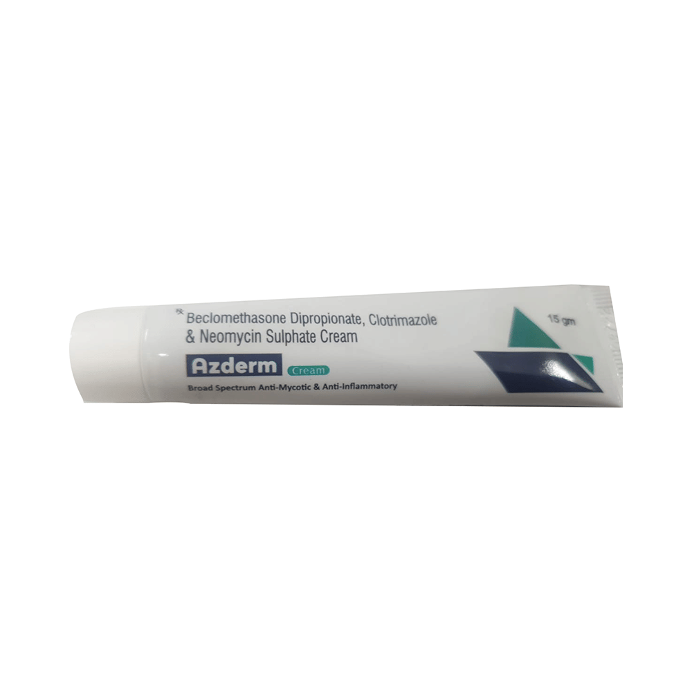 Azderm Cream is a combination of medicines used to treat various types of skin infections. It minimizes symptoms of inflammation such as redness, swelling, and itching. It also prevents the growth of infection-causing microorganisms to promote faster healing of infections. Azderm Cream is only meant for external use and should be used as advised by your doctor. A thin layer of the medicine should be applied only to the affected areas of the skin with clean and dry hands. If it gets into your eyes, nose, mouth or vagina rinse with water. It may take several days to weeks for your symptoms to improve, but you should keep using this medicine regularly. The course of the treatment should be completed to ensure better efficacy of the medicine. If your condition does not improve or gets worse, you should talk to your doctor.The most common side effect of this medicine includes itching, irritation, redness, and burning sensation at the application site. These are usually self-limiting. Regular application of moisturizer to the skin can help to overcome or prevent dryness of the skin, also you must drink plenty of water to keep yourself hydrated. Serious side effects are rare. You must consult the doctor if you experience any allergic reaction (rashes, itching, swelling, shortness of breath, etc.).Before using this medicine, it is important to tell your doctor if you are taking or have recently taken any other medicines for the same disease or other diseases. Pregnant and breastfeeding women should use this medicine with proper consultation and caution. If you have a known allergy to the medicine, you must refrain from using this medicine and consult the doctor about this condition. During the course of the treatment, do not touch or scratch the infected skin areas as this may worsen or spread the infection.