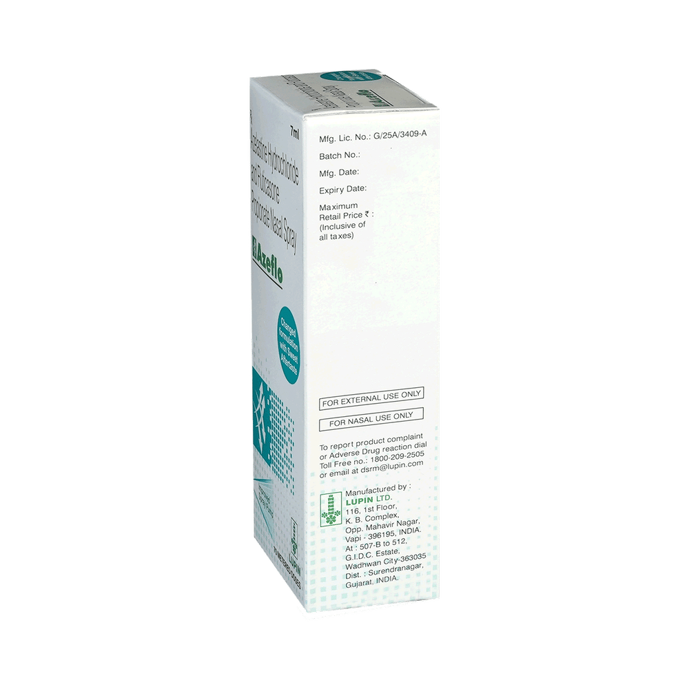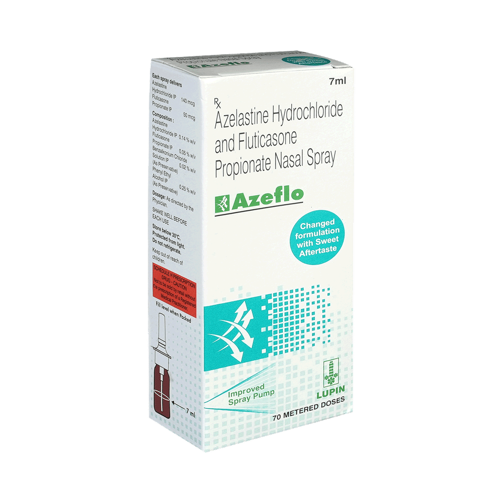 AZEflo Nasal Spray is a combination medicine used in the treatment of allergy symptoms such as runny nose, stuffy nose, sneezing, watery eyes and congestion or stuffiness. AZEflo Nasal Spray should be used as you have been advised by your doctor. Do not use it more often or for longer than recommended. Normally you should blow your nose gently before using it. Keep one nostril closed while instilling the medicine into the other, and then sniff hard to make sure it reaches deep into the nose. Then repeat for the other nostril. It provides relief very quickly and can last for several hours.The most common side effects are taste change, nosebleeds, and headaches. Most of these are temporary and usually resolve with time. Contact your doctor straight away if you are at all concerned about any of these side effects.Never support self-medication or recommend your medicine to another person. It is beneficial to have plenty of fluids while taking this medication. Before you start taking this medicine it is important to inform your doctor if you are suffering from liver or kidney disease. You should also tell your doctor if you are pregnant, planning pregnancy, or breastfeeding.