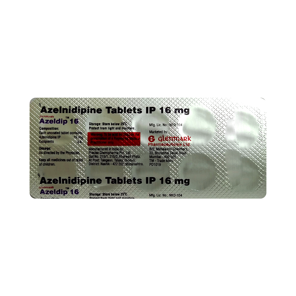 Azeldip 16 Tablet is a medicine used to treat high blood pressure (hypertension). It belongs to a class of medicines known as calcium channel blocker which helps to lower blood pressure and reduce the workload of the heart. This helps prevent heart attacks and strokes. Azeldip 16 Tablet may be prescribed alone or along with other medicines. The dose depends on your blood pressure levels and the severity of your condition. You can take it at any time of the day, with or without food, but it is best to take it at the same time each day. Keep taking it for as long as advised by your doctor. Do not stop this medicine on your own, even if you feel well because high blood pressure often has no symptoms. This makes it hard to identify any sudden spike and if you stop taking it, your condition may get worse.Keeping active with regular exercise, reducing your weight, and eating a healthy diet will also help control your blood pressure. Follow your doctor’s advice while taking this medicine. Studies have shown that it also has a protective effect on the heart.The most common side effects include itching, drowsiness, constipation, abdominal pains, diarrhea, and frequent urination. Consult your doctor if any of these bother you, or do not go away. They may be able to suggest ways to reduce the side effects.Before taking it, let your doctor know if you have any liver, heart, or kidney problems. Pregnant or breastfeeding women should also consult their doctor for advice before taking this medicine. You also need to tell your doctor what other medicines you are taking, especially those used to treat high blood pressure or heart conditions. You should have your blood pressure checked regularly to make sure that this medicine is working properly.