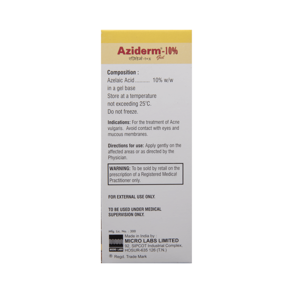 Aziderm 10% Gel is used in the treatment of acne (pimples). It effectively relieves symptoms such as lumps, redness, and swelling associated with different forms of acne. It works by killing acne-causing bacteria. Aziderm 10% Gel is for external use only. You should always use it exactly as prescribed. Both the affected area and your hands should be clean and dry before application. Use this medicine regularly to get the most benefit from it. Do not use more than you need as it will not clear your condition faster and some side effects may be increased. If your condition goes on for longer than four weeks or gets worse at any time, let your doctor know. You can help this medication work better by keeping the affected areas clean.Aziderm 10% Gel has a few potential side effects but not everyone will get them. These include application site reactions like burning, irritation, itching, and redness. Let your doctor know if you’re bothered by these or they do not go away. Avoid getting the medicine in your eye. In case of accidental contact, rinse thoroughly with water.If you are pregnant, breastfeeding, or plan to become pregnant, you should consult your doctor before using this medicine.
