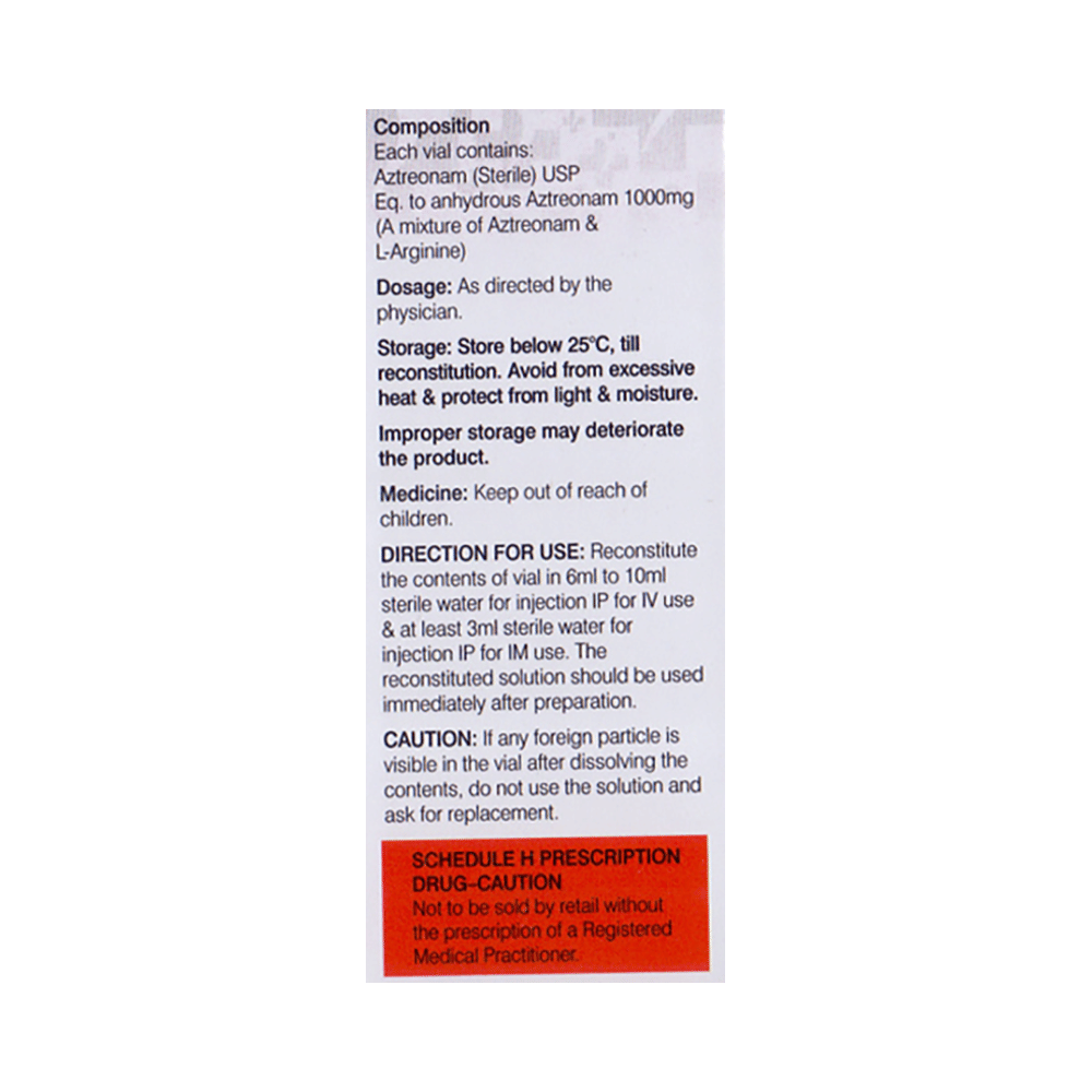 Aztreospey 1G Injection is an antibiotic used to prevent or treat a wide variety of bacterial infections. This may include infections of the urinary tract, blood, brain, ear, skin, soft tissue, abdomen, bone, windpipe, and lungs. Aztreospey 1G Injection is given as a drip (intravenous infusion) or as an injection directly into a vein or a muscle under the supervision of a healthcare professional. Get the injection for as long as the doctor has prescribed. Do not skip any doses and finish the full course of treatment even if you feel better. Stopping the medicine too early may lead to the infection returning or worsening.Common side effects of Aztreospey 1G Injection include rash, vomiting, nausea, and diarrhea. Temporary pain, swelling, and redness at the injection site may also occur at the injection site. Consult your doctor if any of these side effects persist or if your condition does not improve despite treatment.Inform your doctor if you have any previous history of allergy or heart problems before taking this medicine. Pregnant or breastfeeding women should consult their doctor before using this medicine.