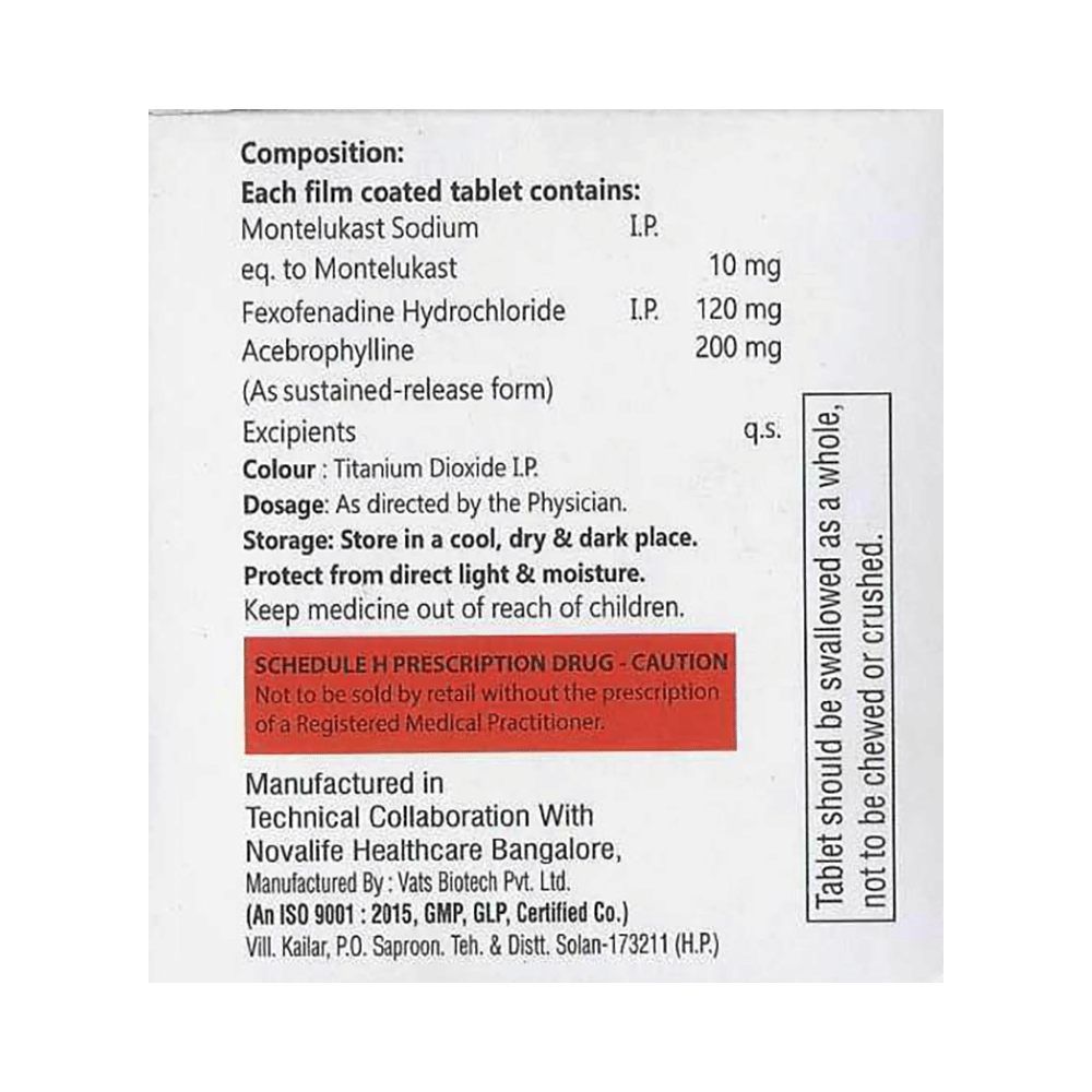 Salt Composition: Montelukast (10mg) + Fexofenadine (120mg) + Acebrophylline (200mg)