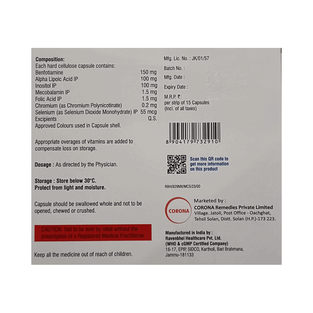 Salt Composition: Methylcobalamin (1.5mg) + Alpha Lipoic Acid (100mg) + Myo-Inositol (100mg) + Folic Acid (1.5mg) + Chromium Picolinate (0.2mg) + Selenium (55mcg) + Benfotiamine (150mg)