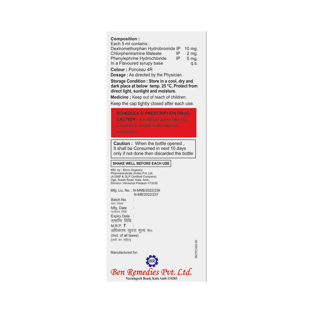 Salt Composition: Phenylephrine (5mg/5ml) + Chlorpheniramine Maleate (2mg/5ml) + Dextromethorphan Hydrobromide (10mg/5ml)