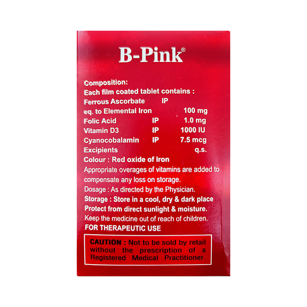 B-Pink Tablet is a combination nutritional supplement prescribed to treat nutritional deficiencies. It ensures the proper growth and functioning of the body. B-Pink Tablet may be taken with or without food. However, it should be used in the dose and duration prescribed by your doctor. Taking more than the recommended dose may cause undesirable side effects. Also, it is advised to take this medicine at a fixed time to avoid missing a dose.It is usually a safe medicine with very minimal or no side effects. However, if you experience severe diarrhea, vomiting, or constipation, consult the doctor without delay.Before taking this medicine, tell the doctor if you have any other health conditions. Inform them if you are taking any other medicines or are pregnant or breastfeeding. It is advised not to consume alcohol after taking this medicine.
