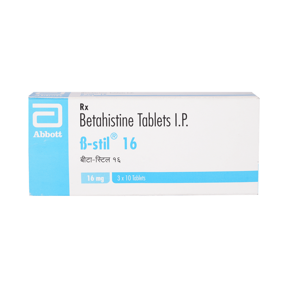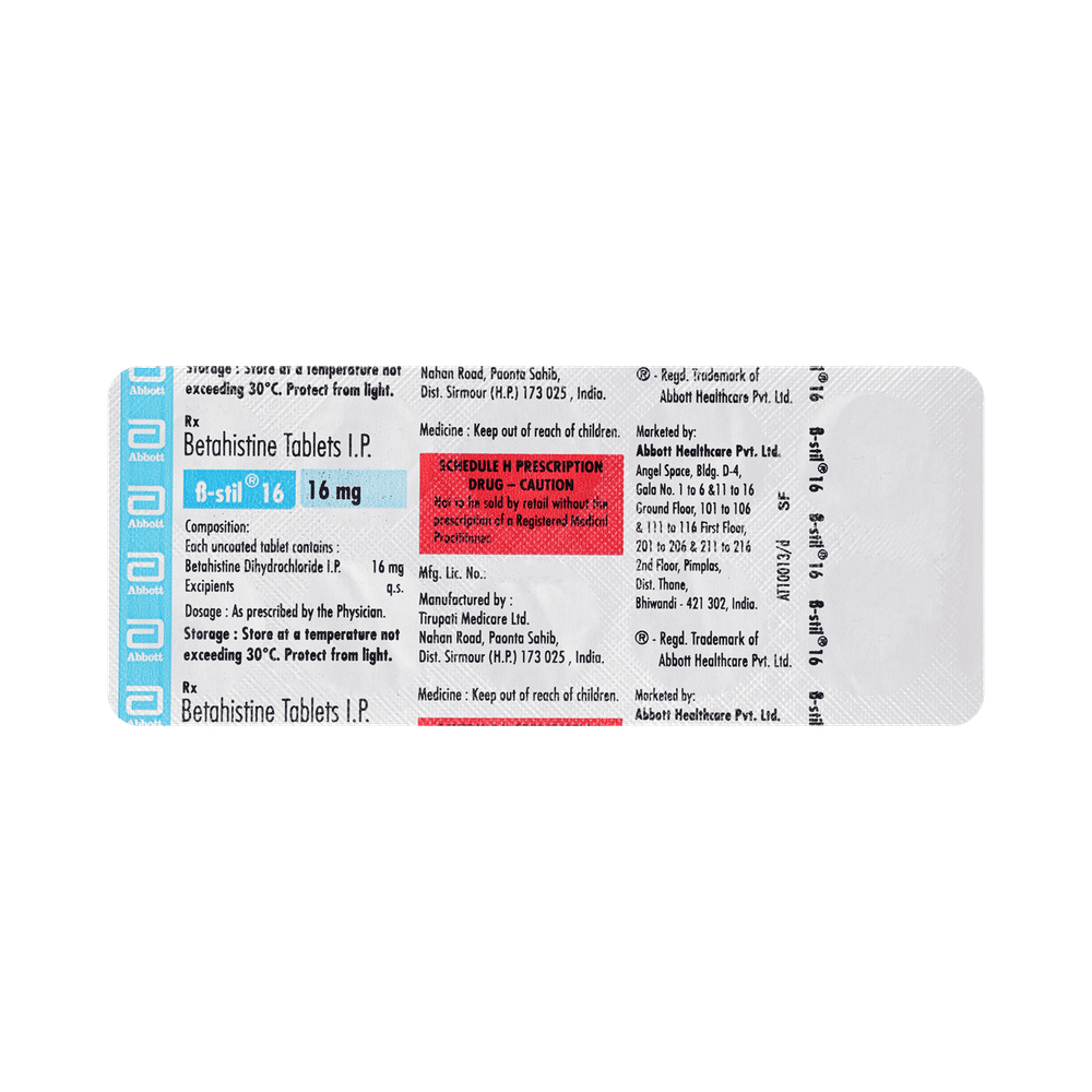 B-Stil 16 Tablet is used to prevent and treat a disorder of the inner ear known as Ménière’s disease. The symptoms include dizziness (vertigo), ringing in the ears (tinnitus), and loss of hearing, probably caused by fluid in the ear. This medicine helps relieve the symptoms by reducing the amount of fluid. B-Stil 16 Tablet should be swallowed whole with water and taken at the same time(s) each day to get the most benefit. Your doctor will decide what is the correct dose to relieve your symptoms and how often you need to take it. You may need to take this medicine for several months and you should take it for as long as prescribed by your doctor, even if you start feeling better. The most common side effects include headache, feeling sick, and indigestion (dyspepsia). You may also get stomach pain and bloating. Taking the medicine with food can help reduce stomach problems. Before taking this medicine, you should talk to your doctor if you have a stomach ulcer, asthma, or high or low blood pressure. You must also tell him/her what other medicines you are taking, to make sure you are safe. Also speak to your doctor if you are pregnant, trying to become pregnant, or breastfeeding.