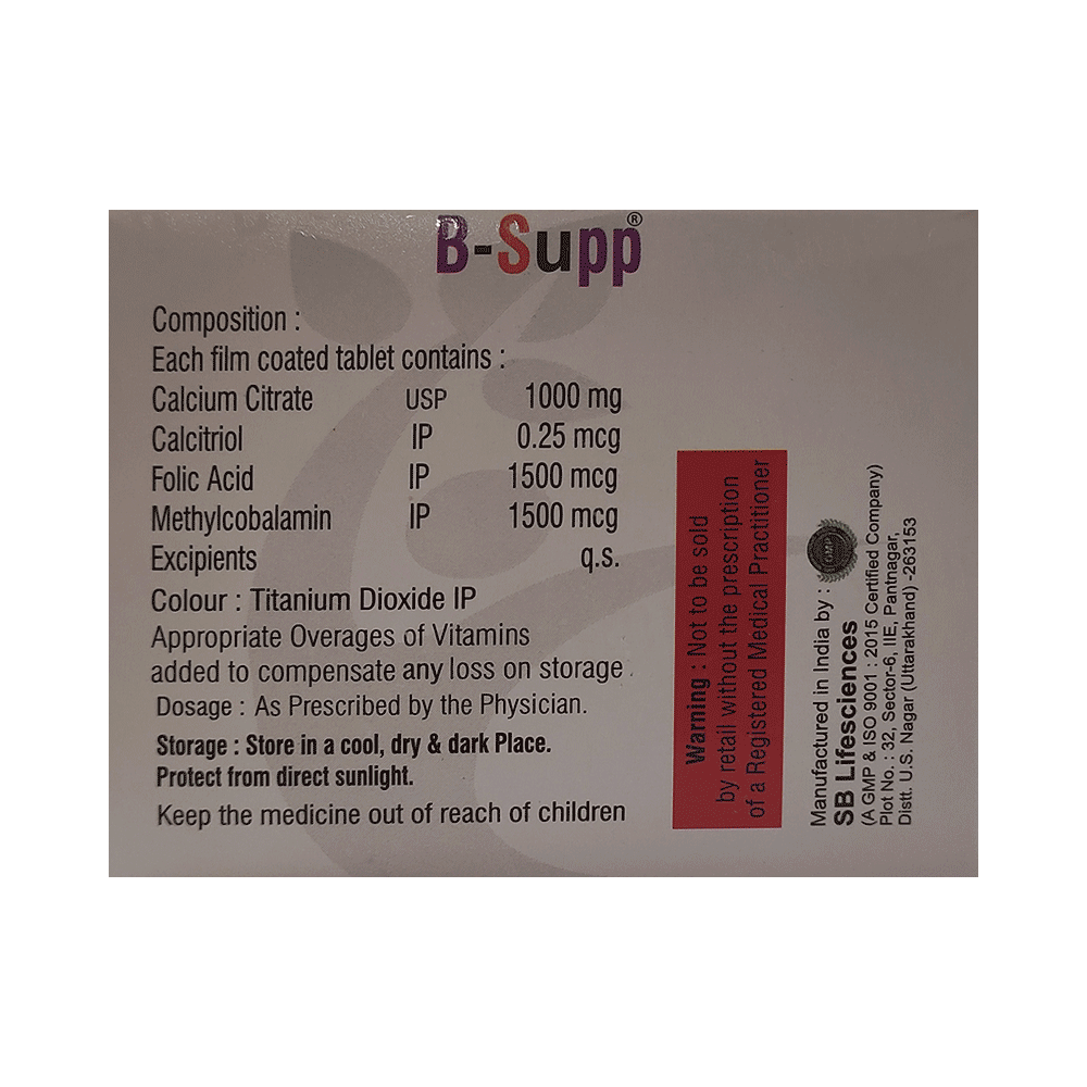 B-Supp Tablet is a combination of four medicines : Calcium citrate, Calcitriol, Folic Acid, and Methylcobalamin. Calcium citrate is a water-soluble calcium supplement. It increases the plasma calcium levels. Calcitriol is the active form of Vitamin D. It raises Vitamin D levels in your blood. This in turn raises calcium levels in your blood by helping you absorb more calcium from your intestine. Folic Acid is a form of vitamin B. It plays a vital role in the formation of red blood cells, which carry oxygen throughout the body. It is also essential in pregnancy due to its role in the development of the unborn baby's brain and spinal cord. Methylcobalamin is a form of vitamin B12 that restores its level in the body thereby helping in treating certain anemias and nerve problems.