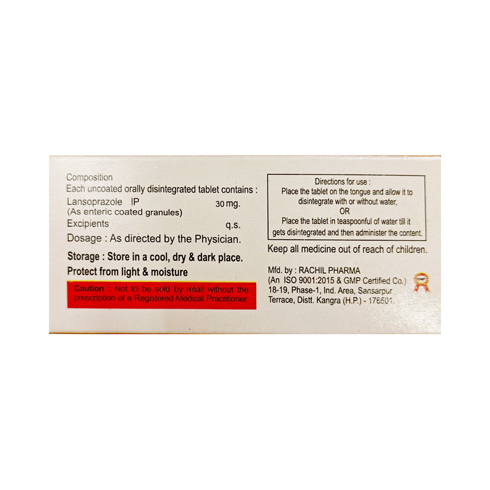 Baby-Lanz 30 Orally Disintegrating Tablet Strawberry is a medicine that reduces the amount of acid produced in your stomach. It is used for treating acid-related diseases of the stomach and intestine, such as acid reflux, peptic ulcer disease, and some other stomach conditions associated with excessive acid production. Baby-Lanz 30 Orally Disintegrating Tablet Strawberry is also used to prevent stomach ulcers and acidity. This medicine should be taken one hour before a meal. The dose and duration of the treatment will depend on your underlying condition and how you respond to the medicine. You should keep on taking it as prescribed, even if your symptoms disappear quickly. You can increase the efficiency of the treatment by eating smaller meals more often and avoiding caffeinated drinks (like tea and coffee) and spicy or fatty foods.The most common side effects of this medicine include nausea, abdominal pain, constipation, and diarrhea. These symptoms are generally mild, but if they bother you or do not go away, consult your doctor. Long-term use of this medicine may increase the risk of side effects. For instance, using this medicine for more than one year may increase your risk of bone fractures, especially with higher doses. Talk to your doctor about ways to prevent bone loss (osteoporosis), such as taking calcium and vitamin D supplements.Before taking Baby-Lanz 30 Orally Disintegrating Tablet Strawberry, you need to tell your doctor if you have severe liver problems or are taking medicines for HIV. Also, if you have ever had an allergic reaction to similar medicines in the past or suffer from bone loss (osteoporosis). Pregnant or breastfeeding women should also consult their doctor before taking it. Prolonged use of painkillers increases the risk of peptic ulcers.