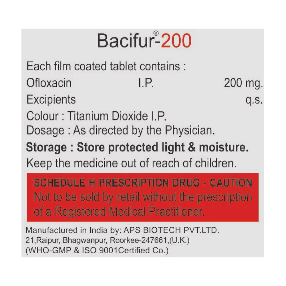Bacifur 200 Tablet is an antibiotic that helps treat bacterial infections. It is used in treating infections of the urinary tract, nose, throat, skin and soft tissues, and lungs (pneumonia). It cures the infection by stopping the further growth of the causative bacteria. Bacifur 200 Tablet should be used in the dose and duration as advised by your doctor. Take it with or without food, preferably at a fixed time. Avoid skipping any doses and finish the full course of treatment even if you feel better.You may experience nausea and stomach pain as the side effects of this medicine. These are usually temporary and resolve on their own, but do consult your doctor if they bother you or persist for a longer duration. Diarrhea may also occur as a side effect but should stop when your course is complete. Inform your doctor if it does not stop or if you find blood in your stools.You should not take this medicine if you are allergic to any of its ingredients. Rarely, some people may have a severe allergic reaction that needs urgent medical attention. Signs of this include rash, swelling of the lips, tongue, or face, shortness of breath, or breathing problems. Let your doctor know if you have a history of kidney disease.