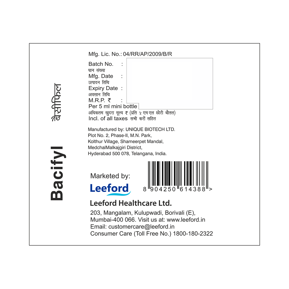 Take this medicine in the dose and duration as advised by your doctor. Check the label for directions before use. Measure it with a measuring cup and take it by mouth. Shake well before use. Bacifyl Oral Suspension may be taken with or without food, but it is better to take it at a fixed time.