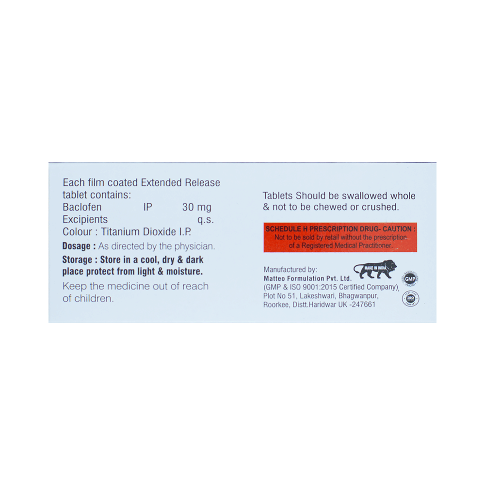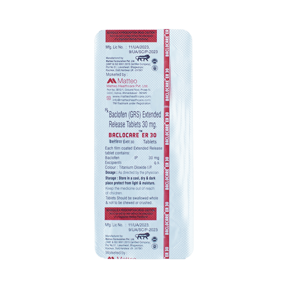 Baclocare ER 30 Tablet provides relief from rigidity, tension and stiffness in muscles (spasticity) that may occur due to various conditions affecting the nervous system.