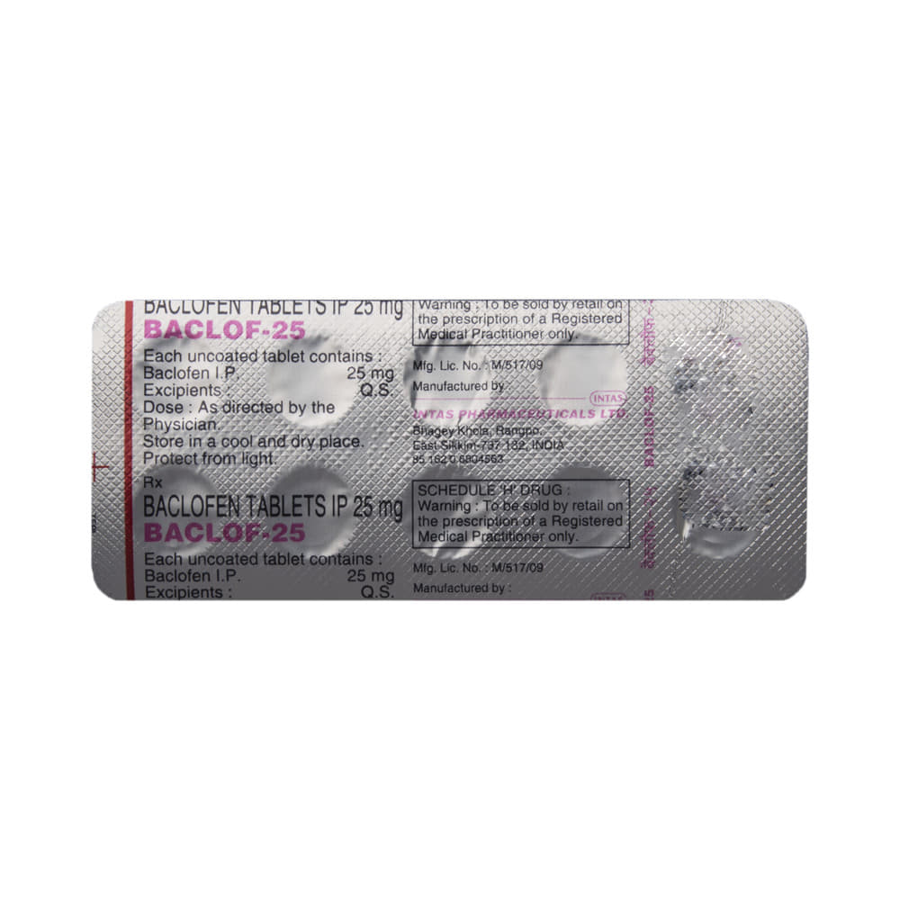 Baclof 25 Tablet is a muscle relaxer. It is used to treat muscular symptoms such as rigidity, tension, and stiffness that may occur due to various conditions such as cerebral palsy, multiple sclerosis, motor neuron disease, or injury to the head, brain, or spine. Baclof 25 Tablet can be taken with food. In general, you should try to use the smallest amount necessary to control your symptoms, for the shortest possible time. You should take this medicine regularly while you need it. Try not to miss doses as this will make the medicine less effective.Some common side effects of this medicine include fatigue, weakness, drowsiness, and dizziness. If any of these side effects do not go away or get worse, you should let your doctor know. Your doctor may be able to suggest ways of preventing or reducing the symptoms.To make sure it is safe for you, before taking this medicine, let your doctor know if you have any medical conditions or disorders. You should also tell your doctor all the other medicines you are using or taking. Pregnant and breastfeeding women should consult their doctors before using this medicine.