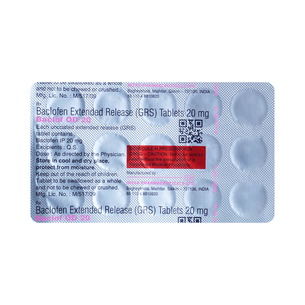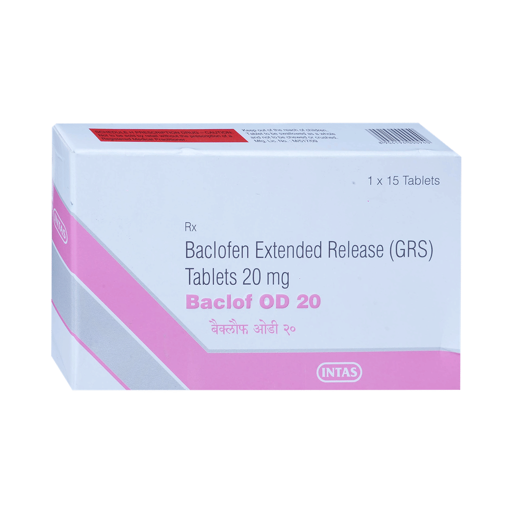 Baclof OD 20 Tablet ER is a muscle relaxer. It is used to treat muscular symptoms such as rigidity, tension, and stiffness that may occur due to various conditions such as cerebral palsy, multiple sclerosis, motor neuron disease, or injury to the head, brain, or spine. Baclof OD 20 Tablet ER can be taken with food. In general, you should try to use the smallest amount necessary to control your symptoms, for the shortest possible time. You should take this medicine regularly while you need it. Try not to miss doses as this will make the medicine less effective.Some common side effects of this medicine include fatigue, weakness, drowsiness, and dizziness. If any of these side effects do not go away or get worse, you should let your doctor know. Your doctor may be able to suggest ways of preventing or reducing the symptoms.To make sure it is safe for you, before taking this medicine, let your doctor know if you have any medical conditions or disorders. You should also tell your doctor all the other medicines you are using or taking. Pregnant and breastfeeding women should consult their doctors before using this medicine.