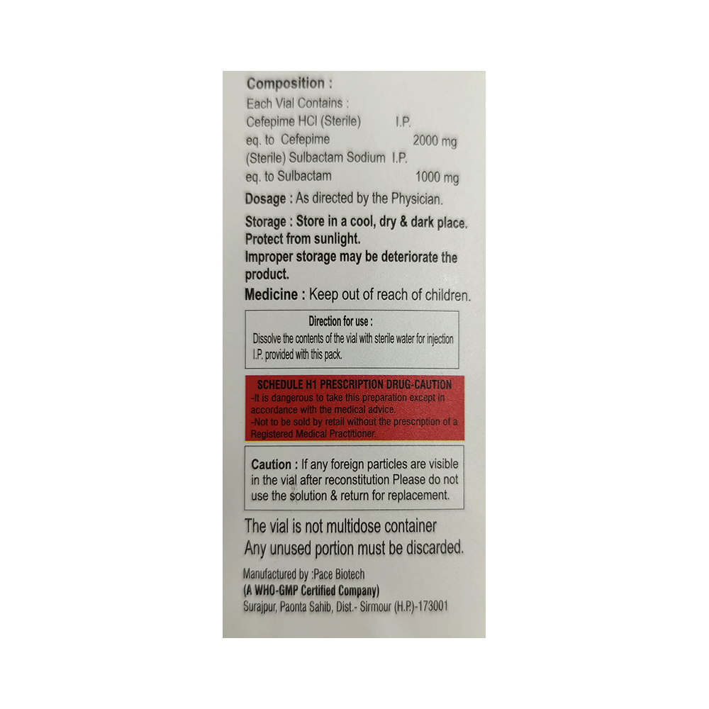 Salt Composition: Cefepime (2000mg) + Sulbactam (1000mg)