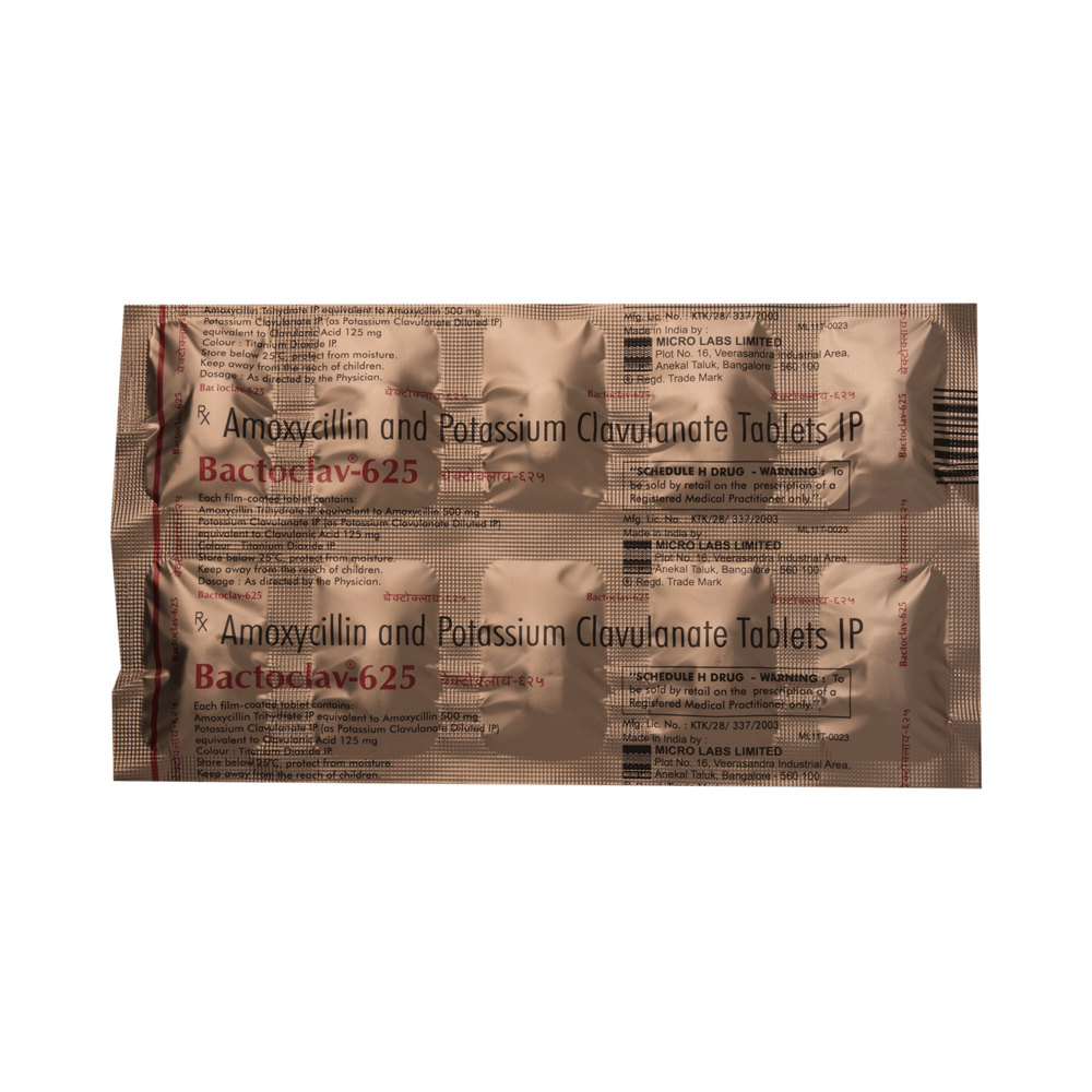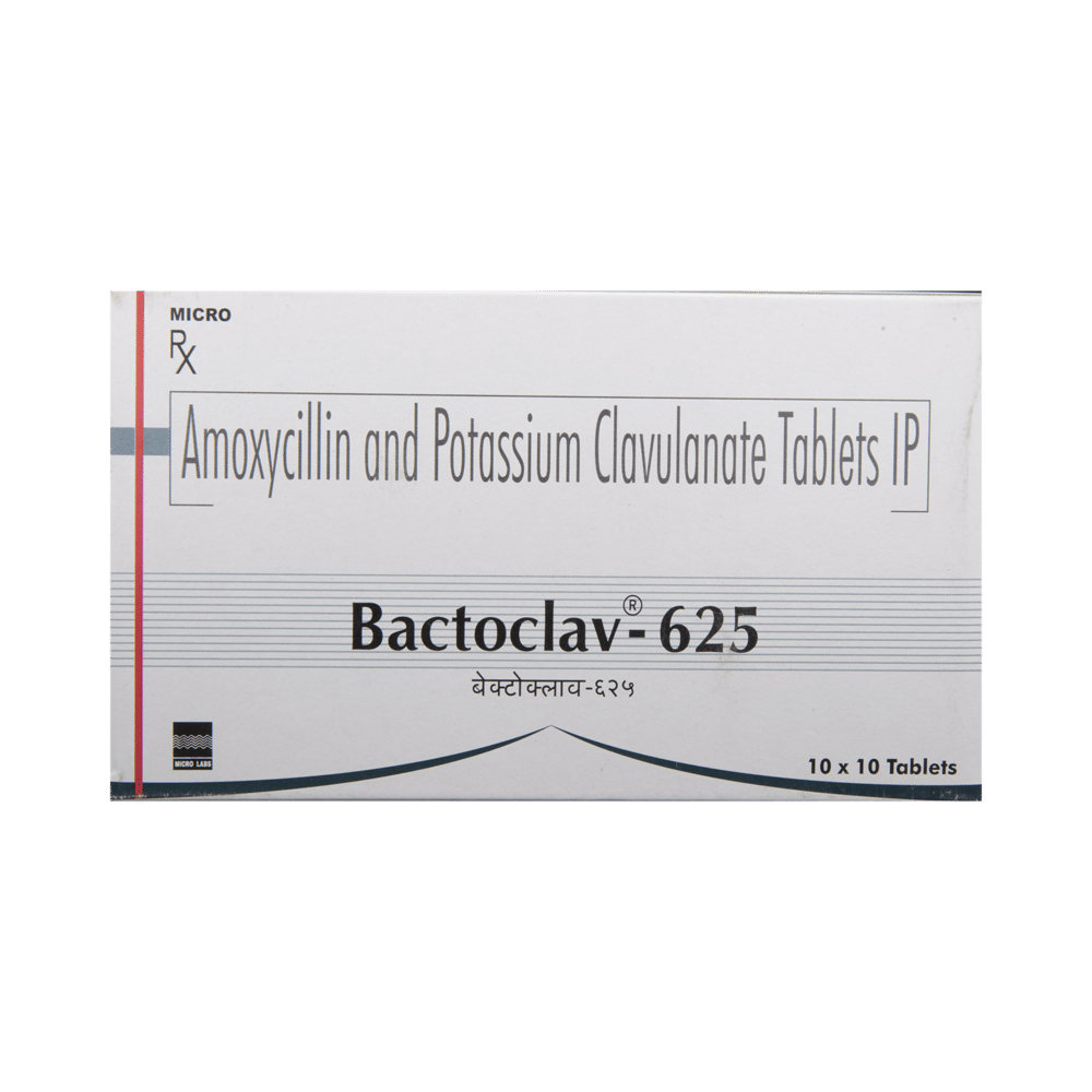 Bactoclav 625 Tablet is an antibiotic that helps your body fight infections caused by bacteria. It is used to treat infections of the lungs (e.g., pneumonia), the ear, the nasal sinus, the urinary tract, the skin, and the soft tissue. It will not work for viral infections such as the common cold. Bactoclav 625 Tablet is best taken with a meal to reduce the chance of a stomach upset. You should take it regularly at evenly spaced intervals as per the schedule prescribed by your doctor. Taking it at the same time daily will help you remember to take it. The dose will depend on what you are being treated for, but you should always complete an entire course of this antibiotic as your doctor prescribes. Please do not stop taking it until you have finished, even when you feel better. If you stop taking it early, some bacteria may survive, and the infection may return or worsen.The most common side effects of Bactoclav 625 Tablet include recurrent or persistent fungal infection (mucocutaneous candidiasis), nausea, diarrhea, and vomiting. If you experience any side effects that are persistent or worsen, consult your doctor for guidance.Before taking it, let your doctor know if you are allergic to any antibiotics or have kidney or liver problems. You should also inform your doctor about all other medicines you are taking, as they may affect or be affected by Bactoclav 625 Tablet. Pregnant and breastfeeding women should consult their doctor before using this medicine to make sure it is safe.