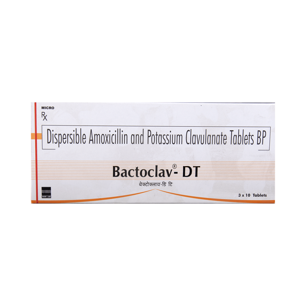 Bactoclav - DT Tablet is an antibiotic medicine that helps treat bacterial infections of the ear, nose, throat, chest, lungs, teeth, skin, and urinary tract. It is capable of killing bacteria that have become resistant to other therapies and thus also helps treat tuberculosis that is resistant to other treatments. You can give Bactoclav - DT Tablet to your child with or without food. It is better to give it with food as that helps increase absorption and decrease the risk of stomach upset. The doctor may prescribe giving it two to three times a day. Medicine dose depends on the severity of the infection, its type, and your child’s body weight and age. So, stick to the dose, time, and way prescribed. If your child vomits the medicine within 30 minutes of intake, let the child calm down and repeat the dose. Do not double dose if it's the time for the next dose.Bactoclav - DT Tablet may cause vomiting, diarrhea, nausea, abdominal pain, and allergy. These side effects should diminish on their own. But, in case they persist or start bothering your child, you must not delay speaking to your child’s doctor.Share your child’s entire medical history with the doctor, including any previous episode of allergy, heart problem, a blood disorder, birth defects, airway obstruction, lung anomaly, gastrointestinal problem, skin disorder, liver impairment, and kidney malfunction. This information will assist the doctor in making dose alterations and in planning your child’s overall treatment.