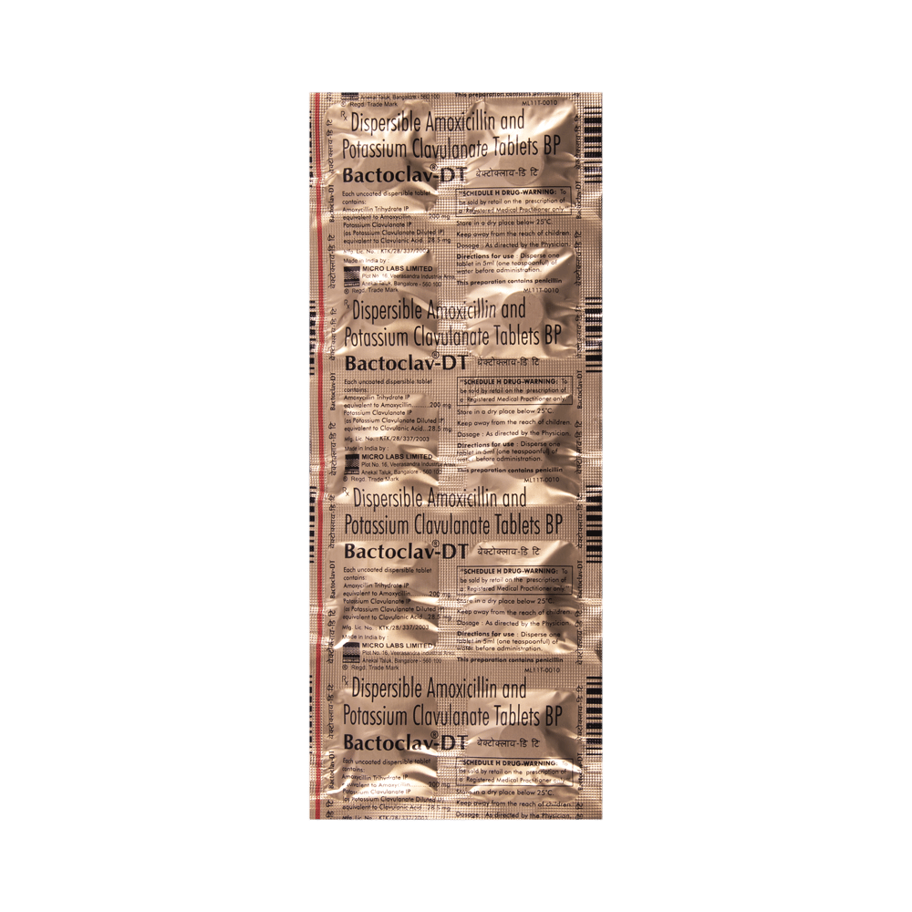 Bactoclav - DT Tablet is an antibiotic. It has two active agents, amoxycillin and clavulanic acid. Amoxycillin works by preventing the formation of the bacterial protective covering (cell wall) essential for the survival of the bacteria. Whereas, clavulanic acid serves a special purpose of inhibiting an enzyme (beta-lactamase) that is produced by resistant bacteria. This makes the combination of amoxycillin and clavulanic acid an effective line of treatment for many types of infections.