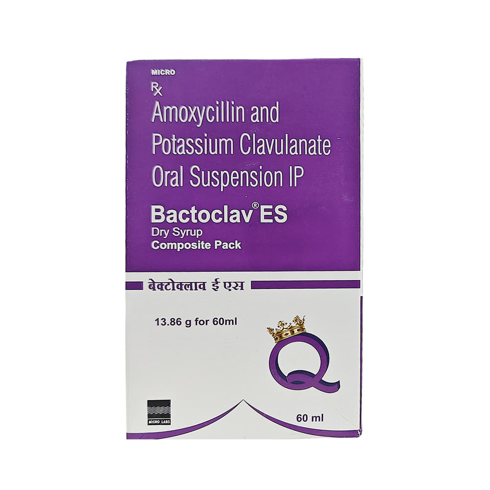 Bactoclav ES Dry Syrup is a combination of two medicines: Amoxycillin and Clavulanic Acid. Amoxycillin is an antibiotic. It works by preventing the formation of the bacterial protective covering, which is essential for the survival of bacteria. Clavulanic Acid is a beta-lactamase inhibitor that reduces resistance and enhances the activity of Amoxycillin against bacteria.