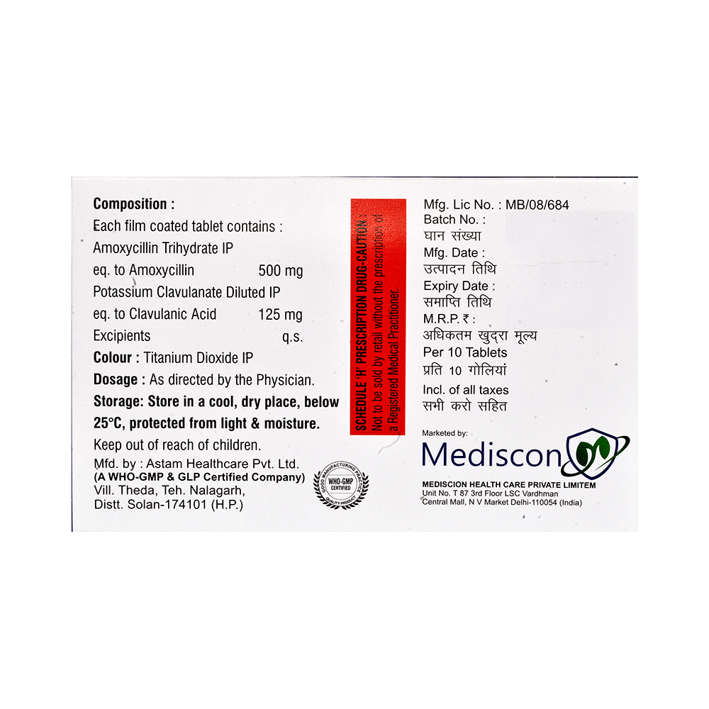 Salt Composition: Amoxycillin (500mg) + Clavulanic Acid (125mg)
