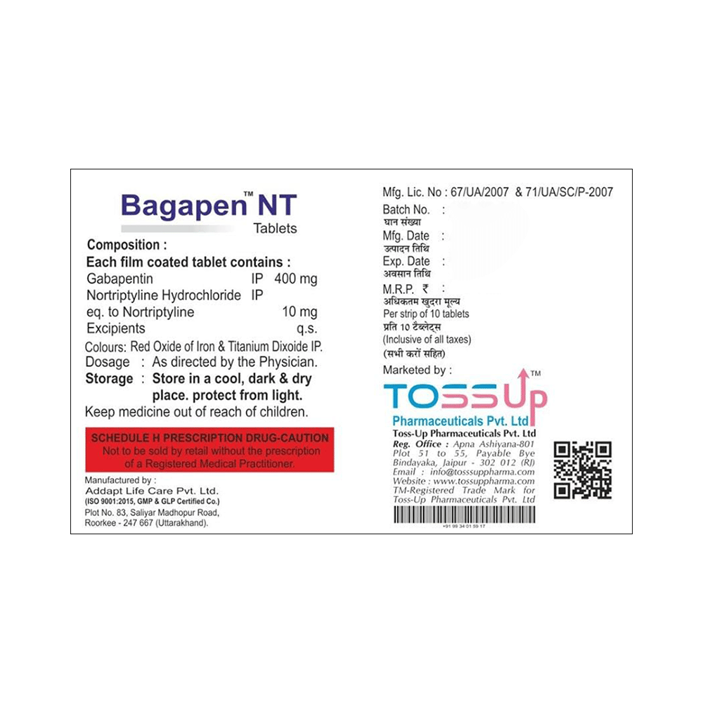 Bagapen-NT Tablet is a combination of two medicines: Gabapentin and Nortriptyline. Gabapentin is an alpha 2 delta ligand which decreases the pain by modulating calcium channel activity of the nerve cells. Nortriptyline is a tricyclic antidepressant which increases the levels of chemical messengers (serotonin and noradrenaline) that stop the movement of pain signals in the brain. Together, they relieve neuropathic pain (pain from damaged nerves).