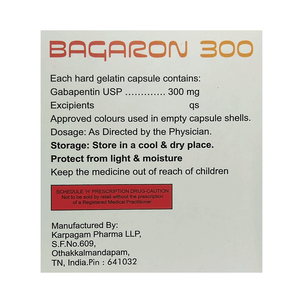 Bagaron 300 Capsule is a medicine used to relieve the pain caused by nerve damage (neuropathic pain) due to various conditions like diabetes, shingles (herpes zoster infection), spinal cord injury, etc. It is also used to treat certain types of seizures (fits) in combination with other medicines. Bagaron 300 Capsule belongs to the anti-epileptic group of medicines. You may take it with or without food, but it is important to take this medicine at the same time each day to get the most benefit. The exact dose and duration of treatment will depend on your condition and how you respond to it. Your doctor will probably start this medicine at a low dose and increase it gradually. It may take a few weeks for the medicine to work properly. Follow your doctor’s instructions and continue taking it regularly until your doctor advises you to stop. Do not miss any dose, otherwise, your condition may worsen.Most people taking Bagaron 300 Capsule do not experience any side effects. The most common ones are feeling sleepy, dizzy, or tired (fatigue). These are usually mild and go away by themselves as your body gets used to the medicine. Most side effects are not serious and do not need medical attention. Talk to your doctor if any of the side effects persist or worry you.You should avoid drinking alcohol along with this medicine as it may lead to excessive sleepiness and dizziness. Let your doctor know right away if you develop any unusual mood changes like anxiety, agitation, depression, or thoughts about harming yourself.Before taking Bagaron 300 Capsule, you should tell your doctor if you have any kidney-related problems or if you are more than 65 years old. Your doctor may prescribe a different dose in such people. Women who are pregnant, breastfeeding, or planning to become pregnant should also consult their doctor before using this medicine.