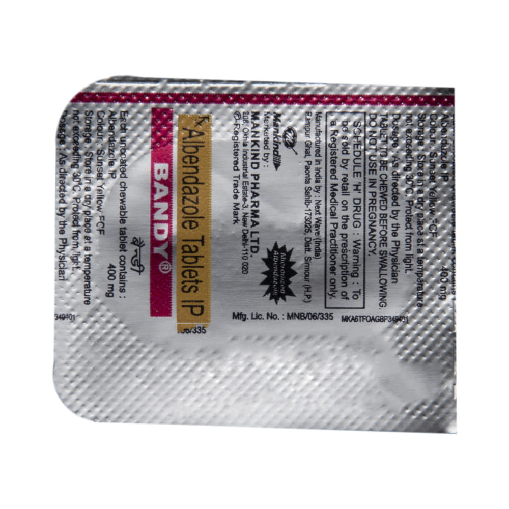 In Treatment of Parasitic infectionsBandy Chewable Tablet is an antibiotic medicine that helps treat many parasitic worm infections. It works by killing and stopping the further growth of parasites causing the infection. This medicine usually makes you feel better quite quickly. However, you should continue taking it as long as it is prescribed even when you feel better, to make sure that all parasites are killed and do not become resistant. This medicine is generally safe to use while pregnant or breastfeeding, but you should ask your doctor.