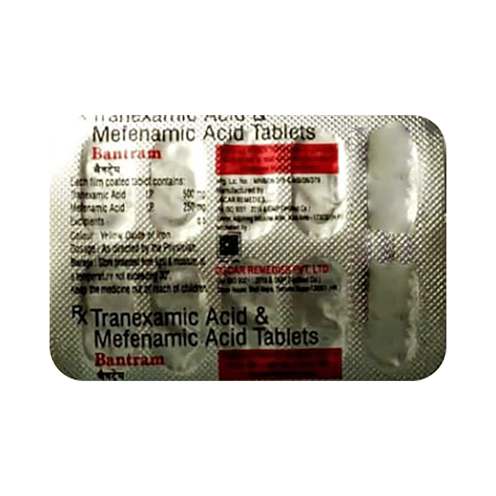 Bantram Tablet is a combination of two medicines: Tranexamic Acid and Mefenamic Acid. Tranexamic Acid is an anti-fibrinolytic. It works by preventing the breakdown of blood clots to control excessive bleeding during periods. Mefenamic Acid is a non-steroidal anti-inflammatory drug (NSAID) which blocks the production of certain chemical messengers (prostaglandins) that cause pain and inflammation (redness and swelling).