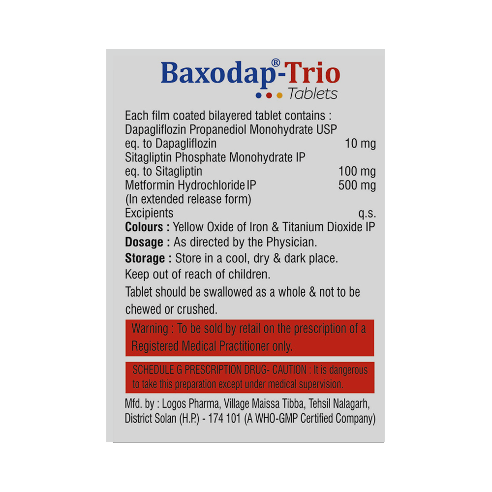 Baxodap-Trio Tablet ER is a combination of three antidiabetic medicines. Dapagliflozin increases urinary glucose excretion and reduces blood glucose levels. Metformin decreases the amount of glucose you absorb from your food and the amount of glucose made by the liver. Metformin also increases the body's response to insulin, a natural substance that controls the amount of glucose in the blood. Sitagliptin helps control blood sugar levels by increasing substances (incretins) in the body that make the pancreas release more insulin. It also signals the liver to stop producing sugar (glucose) when there is too much sugar in the blood.