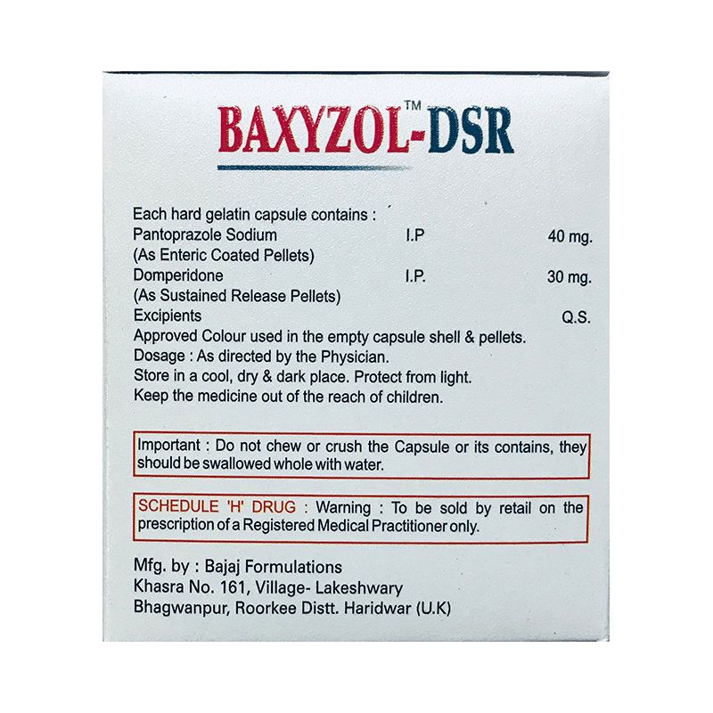 Baxyzol-DSR Capsule is a medicine that is used to treat conditions like acid reflux disease (GERD), erosive esophagitis, gastritis, gastric and duodenal ulcers, and indigestion with symptoms like heartburn, bloating, and regurgitation. It works by lowering acid production and helping the stomach empty faster. Take Baxyzol-DSR Capsule exactly as prescribed by your doctor, usually once daily before breakfast. Swallow it whole with water; do not crush or chew. To get the best results, maintain a healthy diet, avoid late-night meals, caffeine, spicy or oily foods, and stop smoking or alcohol use. Do not skip doses or stop early, even if you feel better, as that may lead to a return of the symptoms.The most common side effect of Baxyzol-DSR Capsule is dry mouth. It may also cause headache, dizziness, diarrhea, nausea, or mild stomach discomfort in some people. These are usually temporary. If you experience persistent vomiting, irregular heartbeat, rash, or severe diarrhea, contact your doctor immediately. Staying hydrated and taking the medicine before meals may help reduce stomach-related side effects.Inform your doctor about any liver, kidney, or heart problems before starting Baxyzol-DSR Capsule. Avoid taking it with other drugs that may affect heart rhythm or interact with domperidone or pantoprazole. Do not use it if you have a history of gastrointestinal bleeding or obstruction, or if you are allergic to any of the ingredients in the medicine. Pregnant or breastfeeding women should consult their doctor before use.