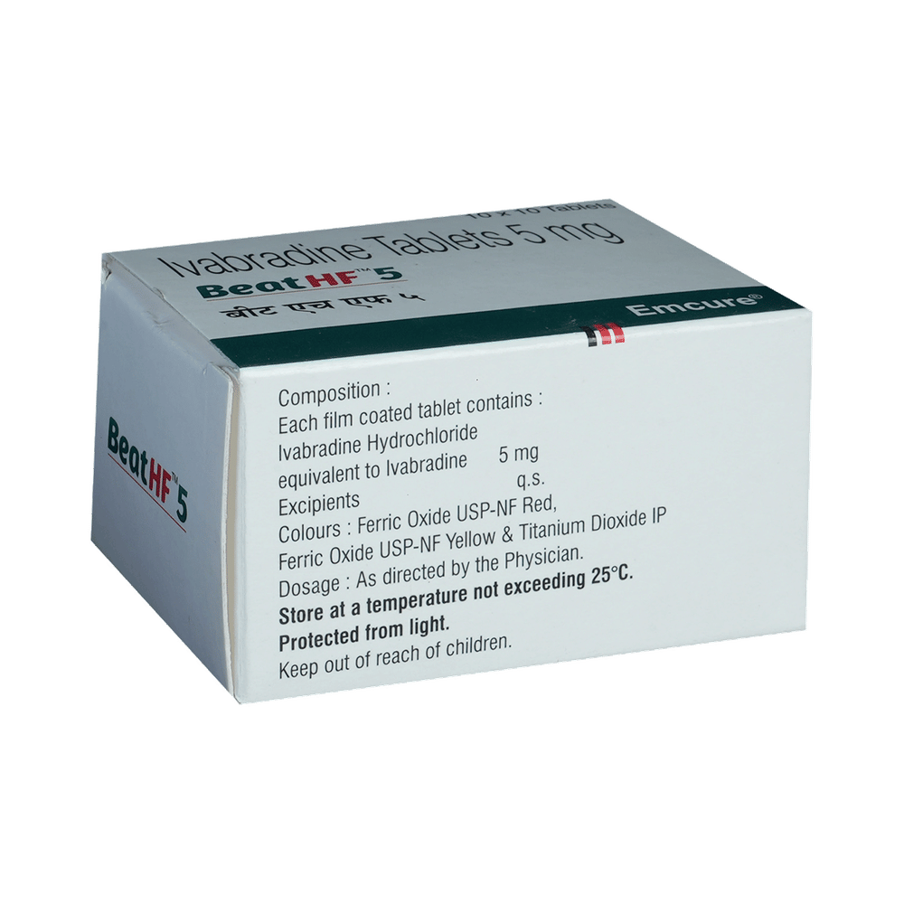 Beat HF 5 Tablet is a medicine used for the treatment of angina (heart-related chest pain) and chronic (long-term) heart failure. It makes the heart work more efficiently by lowering the heart rate. This relieves chest pain and decreases the risk of hospitalization in heart failure patients. The dose will depend on what you are being treated for. Since the treatment for angina or heart failure is usually lifelong, you should not stop using it without talking to your doctor. It should be taken with food at the same time each day. If you take too much in one go, your heart could slow down too much and make you feel breathless or tired. If this happens, call a doctor.The most common side effects are temporary brightness/flashes in your vision, slow heart rate, high blood pressure, atrial fibrillation, dizziness, blurred vision, and ECG changes. Some side effects, such as fainting and significant changes to your heartbeat, may be very serious and may need urgent medical attention. Avoid driving until you know how this medicine will affect you.Do not use Beat HF 5 Tablet if you have severe liver disease, a low resting heart rate, or a heart rhythm disorder. This medicine is also not suitable if you have very low blood pressure and heart failure that has recently become worse. This medicine interacts with certain other medicines used to treat high blood pressure, fungal infections, and HIV. Do not take it if you are pregnant, trying to become pregnant, or breastfeeding.