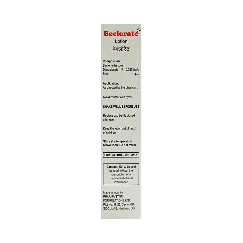 Beclorate Lotion belongs to a group of medicines called steroids. It is used for the treatment of skin disorders such as dermatitis and psoriasis. It relieves swelling, itching, and redness of the skin by suppressing the release of substances that cause inflammation. Beclorate Lotion is for external use only. Use it in the dose and duration as directed by your doctor. Clean and dry the affected area and apply it thinly and evenly over the area. You should not use it too often and more than what your doctor has prescribed. Avoid covering the area being treated with airtight dressings such as bandages, as this may increase the risk of side effects.The most common side effects of this medicine include burning, irritation, itching, redness at the site of application. These are usually temporary and improve with time. However, if they persist or get worse you should let your doctor know. Before using the medicine, consult your doctor if you are pregnant or breastfeeding.