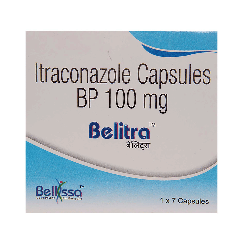 Belitra 100mg Capsule belongs to a group of medicines called antifungals. It works by stopping the growth of fungi and is used to treat infections of the mouth, throat, vagina, and other parts of the body including fingernails and toenails. It kills fungi by destroying the fungal cell membrane. Belitra 100mg Capsule should be taken in the dose and duration as prescribed by your doctor. It should be swallowed whole and can be taken with food. To get the most benefit, take this medicine at evenly spaced times and continue using it until your prescription is finished, even if your symptoms disappear after a few days. If you stop the treatment too early, the infection may return and if you miss doses you can increase your risk of infections that are resistant to further treatment. Tell your doctor if the infection does not get better or if it gets worse.The most common side effects of this medicine include nausea, dizziness, headache, vomiting, diarrhea, abdominal pain, constipation, and dyspepsia. You could ask your doctor about ways of preventing or reducing these effects. Get emergency medical help if you have signs of an allergic reaction like severe skin rash, tingling, difficulty breathing, swelling of your face, lips, tongue, or throat. Do not take it if you are pregnant or could become pregnant unless your doctor has told you to. Talk to your doctor before taking this medicine if you have a history of heart failure, a weak immune system (including HIV/AIDS), kidney problems, or liver problems such as yellow skin (jaundice). This medicine may not be suitable for you. If your course of treatment is for more than a month, your doctor may want to check your liver by testing your blood.