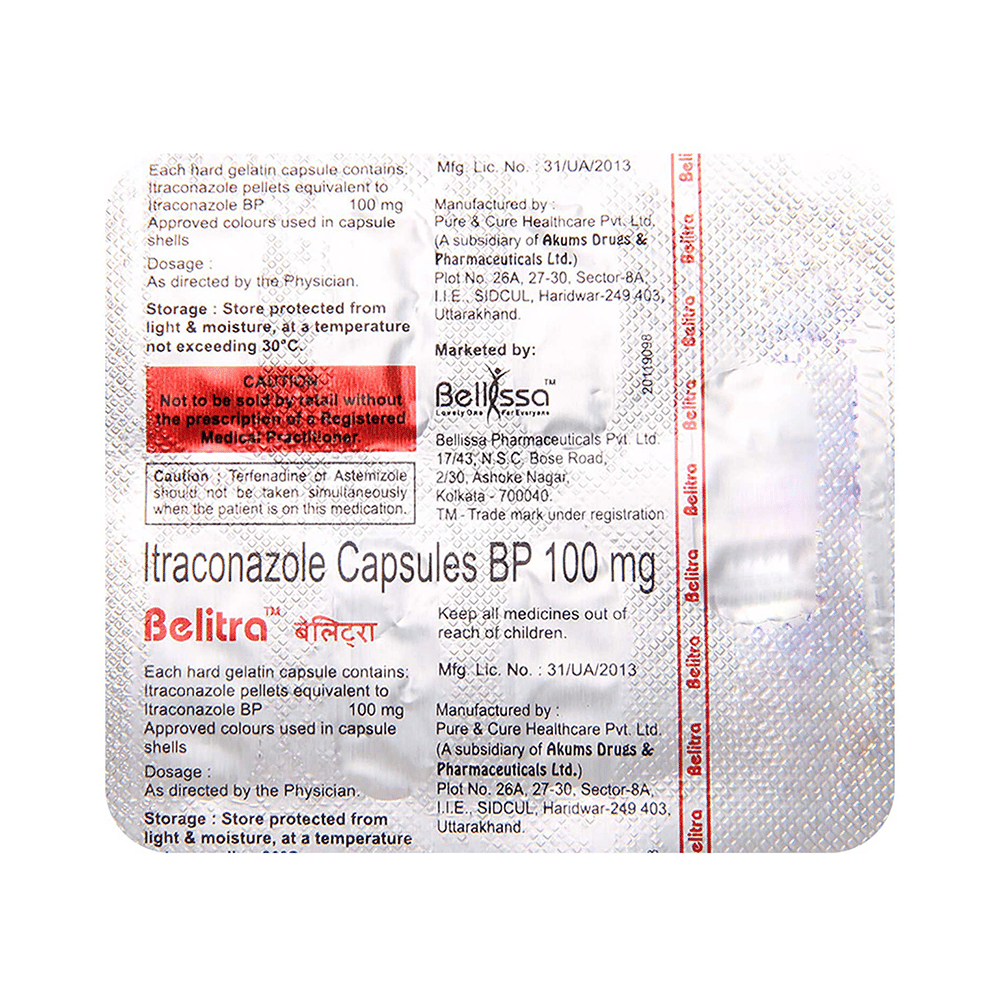 In Treatment of Fungal infectionsBelitra 100mg Capsule is an antifungal medicine. It is used to treat infections in different parts of the body caused by fungi. It works by killing and stopping the growth of fungi. This provides relief from various symptoms caused by the infection and speeds up the healing process. You should keep taking the medicine until you complete the dose even if you get better. This will prevent the infection from returning.
