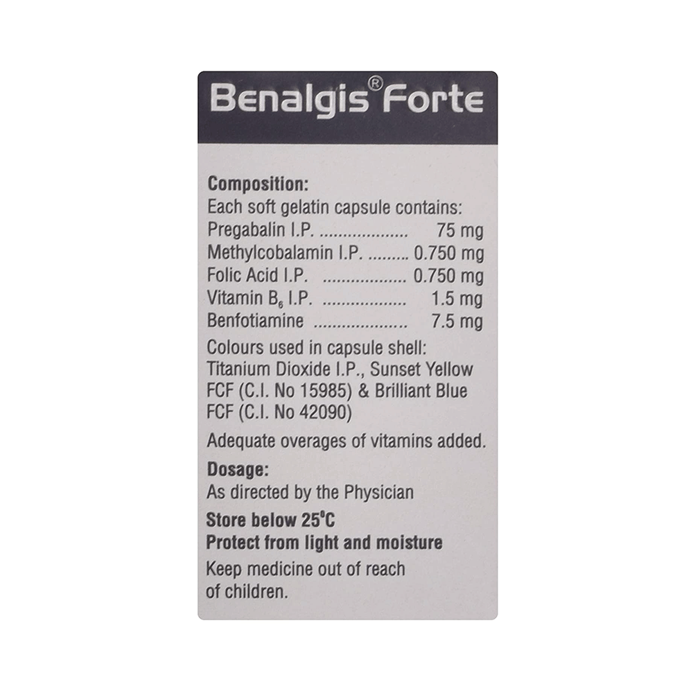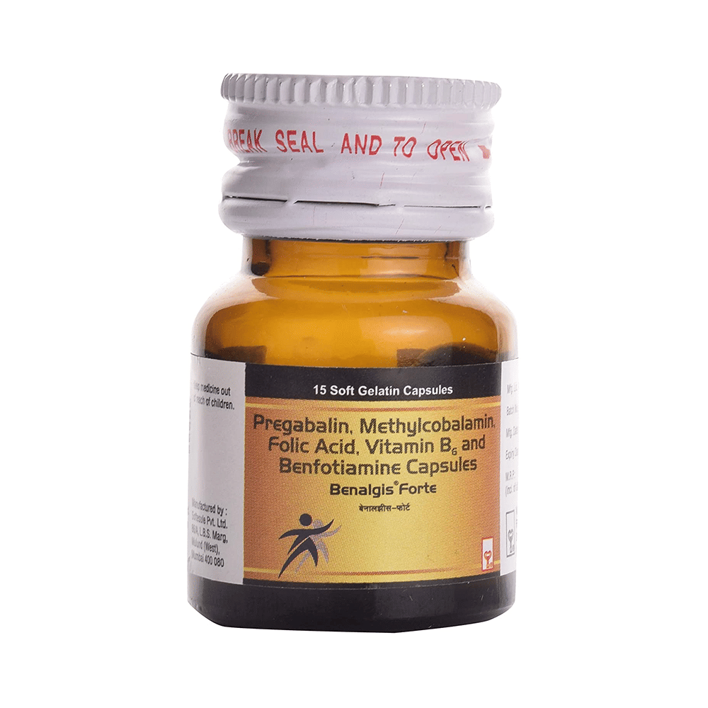 Benalgis Forte Soft Gelatin Capsule is a prescription medicine that helps relieve neuropathic pain (pain from damaged nerves). It strengthens the nerves and relieves nerve pain. Benalgis Forte Soft Gelatin Capsule can be taken with or without food. It should be used in the dose and duration as prescribed by your doctor. It is advised to take this medicine at a fixed time. Do not take more than the recommended dose.Benalgis Forte Soft Gelatin Capsule is usually safe with very minimal side effects. However, if you experience severe diarrhea, vomiting, constipation, or any signs of an allergic reaction, please consult your doctor. Also, before taking this medicine, tell your doctor about all other health conditions that you have.Inform your doctor if you are taking any other medicines or if you are pregnant or breastfeeding. It is not advised to drive after taking this medicine as it may cause sleepiness or dizziness and may affect your ability to concentrate and react.