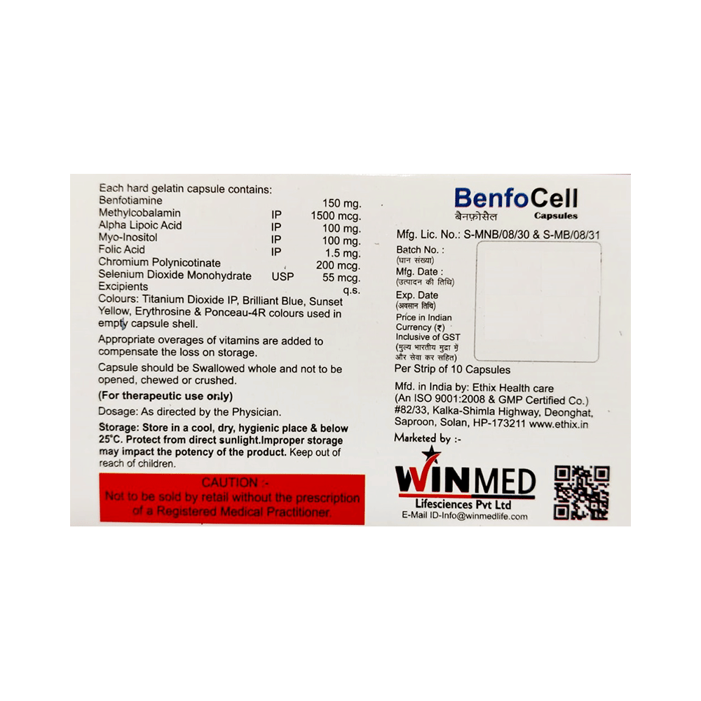 Benfocell Capsule is a combination of Methylcobalamin, Alpha Lipoic Acid, Myo-Inositol, Folic Acid, Chromium Picolinate, Selenium, and Benfotiamine. Methylcobalamin is a form of vitamin B12 that restores its level in the body thereby helping in treating certain anemias and nerve problems. Alpha lipoic acid acts as a potent antioxidant (substance that protects against cell damage) by neutralizing the free radicals (waste products formed in the body during energy production) such as reactive oxygen and nitrogen species. Further, it initiates natural antioxidant processes in the body. It also maintains the levels of Vitamin E and Vitamin C in the body. Myo-inositol works by relaxing the blood vessels and improving blood flow to the legs, toes and fingers, thereby relieving pain. Folic Acid is a form of vitamin B. It plays a vital role in the formation of red blood cells, which carry oxygen throughout the body. It is also essential in pregnancy due to its role in the development of the unborn baby's brain and spinal cord. Chromium Picolinate, Selenium, and Benfotiamine are nutritional supplements that provide essential nutrients to our body and improve overall health.