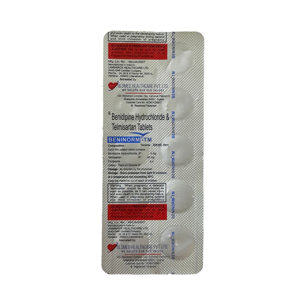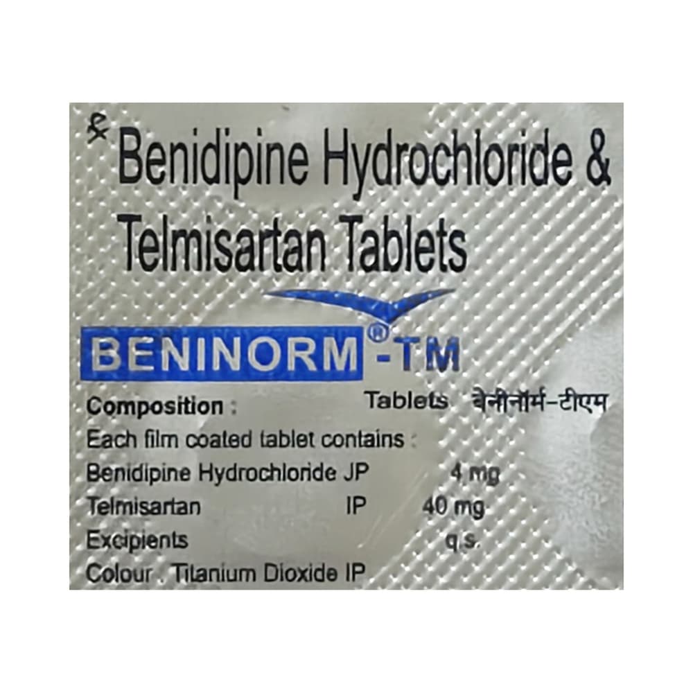 Beninorm TM 4mg/40mg Tablet is a combination of two medicines: benidipine and telmisartan, which lowers blood pressure effectively. Benidipine is a calcium channel blocker (CCB), and telmisartan is an angiotensin receptor blocker (ARB). They work by relaxing the blood vessels and making the heart more efficient at pumping blood throughout the body.
