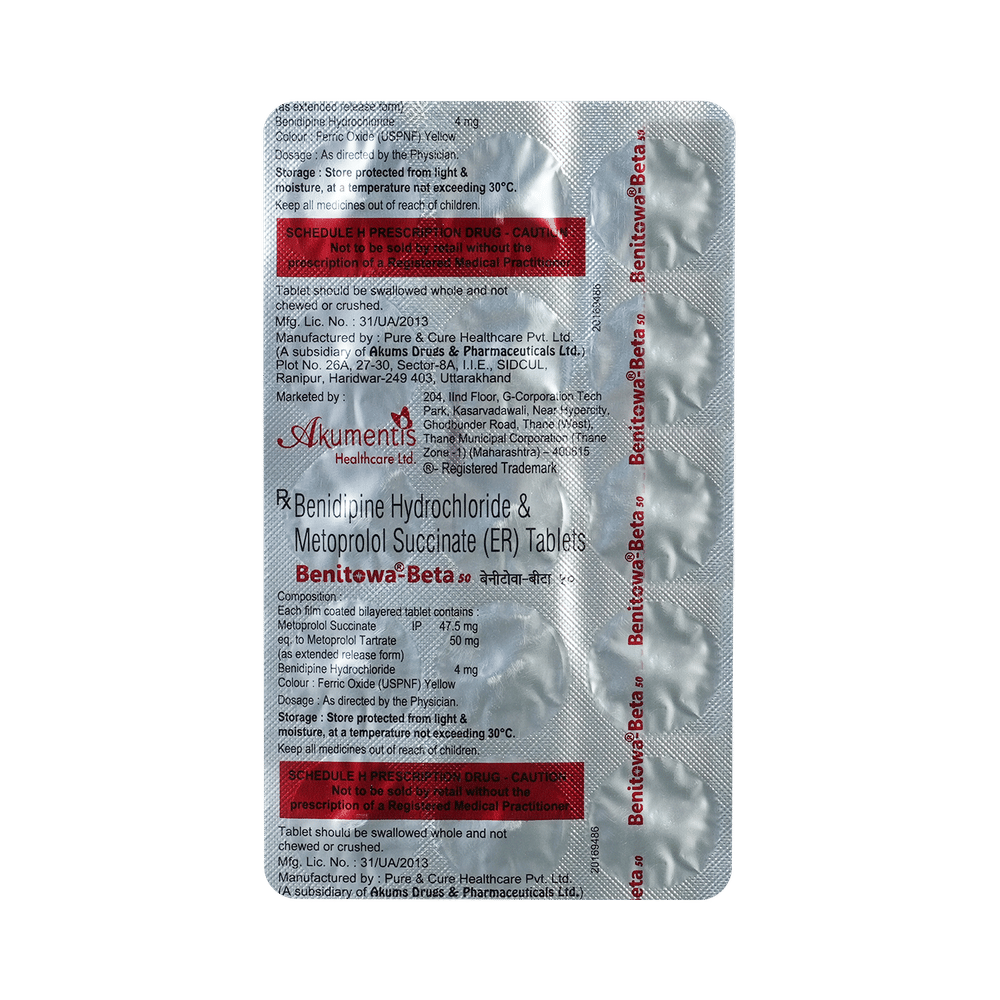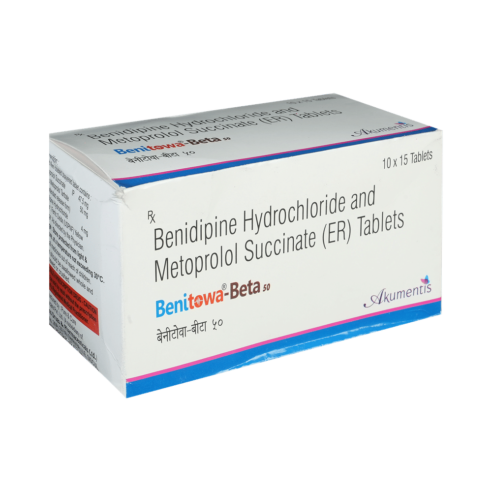 Benitowa-Beta 50 Tablet ER is a combination medicine used in the treatment of hypertension (high blood pressure). It works by relaxing the blood vessels and making the heart more efficient at pumping blood throughout the body. You can take Benitowa-Beta 50 Tablet ER at any time of day, with food, but it is best to take it at the same time each day. Keep taking it for as long as advised by your doctor. Even if you feel well, do not stop this medicine on your own because high blood pressure often has no symptoms. If you stop taking it, your condition may get worse. Keeping active with regular exercise, reducing your weight and eating a healthy diet will also help control your blood pressure. Follow your doctor’s advice while taking this medicine.It may cause side effects like headache, ankle swelling, slow heart rate, and nausea. It may also cause dizziness, so do not drive or do anything that requires mental focus until you know how this medicine affects you. To reduce the swelling, raise your legs while sitting down. You may be asked for regular monitoring of blood pressure, kidney function, blood sugar level, and electrolytes level while on the treatment.Before taking it, let your doctor know if you have any liver or kidney problems. Pregnant or breastfeeding women should also consult their doctor for advice before taking this medicine. You also need to tell your doctor what other medicines you are taking especially those used to treat high blood pressure or heart conditions.