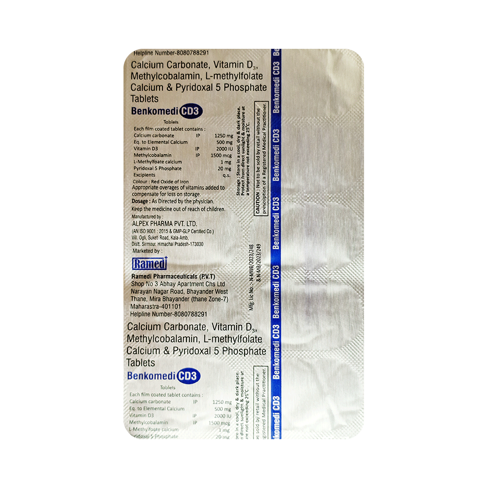 Benkomedi CD3 Tablet is a combination of five medicines : Calcium Carbonate, Vitamin D3, Methylcobalamin, L-Methyl Folate Calcium, and Pyridoxal-5-phosphate. Calcium carbonate is a dietary supplement used when the amount of calcium taken in the diet is not enough. Vitamin D3 is a form of vitamin D. It raises vitamin D levels in your blood. This in turn raises calcium levels in your blood by helping you absorb more calcium from food. Methylcobalamin is a form of vitamin B12 that restores its level in the body thereby helping in treating certain anemias and nerve problems. L-Methyl Folate Calcium and Pyridoxal-5-phosphate are nutritional supplements that provide essential nutrients to our body and improve overall health.