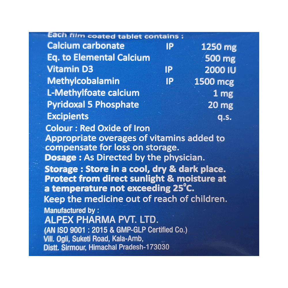 Salt Composition: Calcium Carbonate (500mg) + Vitamin D3 (2000IU) + Methylcobalamin (1500mcg) + L-Methyl Folate Calcium (1mg) + Pyridoxal-5-phosphate (20mg)