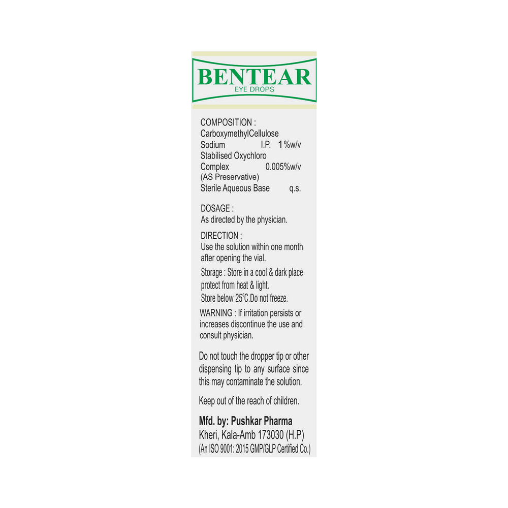 Bentear Eye Drop is an eye lubricant or artificial tears used to relieve dry eyes. This can happen because not enough tears are made to keep the eye lubricated. It helps to soothe the irritation and burning seen in dry eyes by maintaining proper lubrication of the eyes. Bentear Eye Drop is usually taken when needed. Use the number of drops as advised by your doctor. Wait for at least 5-10 minutes before delivering any other medication in the same eye to avoid dilution. Do not use a bottle if the seal is broken before you open it. Always wash your hands and do not touch the end of the dropper. This could infect your eye.The most common side effects of using this medicine include eye irritation (including burning and discomfort), eye pain, eye itching, and visual disturbance. They are usually temporary and disappear with time. However, let your doctor know if they persist or get worse. Do not drive, use machinery, or do any activity that requires clear vision until you are sure you can do it safely. Consult your doctor if your condition does not improve or if the side effects bother you.This medicine is not likely to affect or be affected by other medicines you use, but you should let your doctor know of any medicine, including eye medicine, you are using. Inform your doctor about any past eye illnesses, such as glaucoma. Do not use it while wearing soft contact lenses, and talk to your doctor if you develop an eye infection while using it.