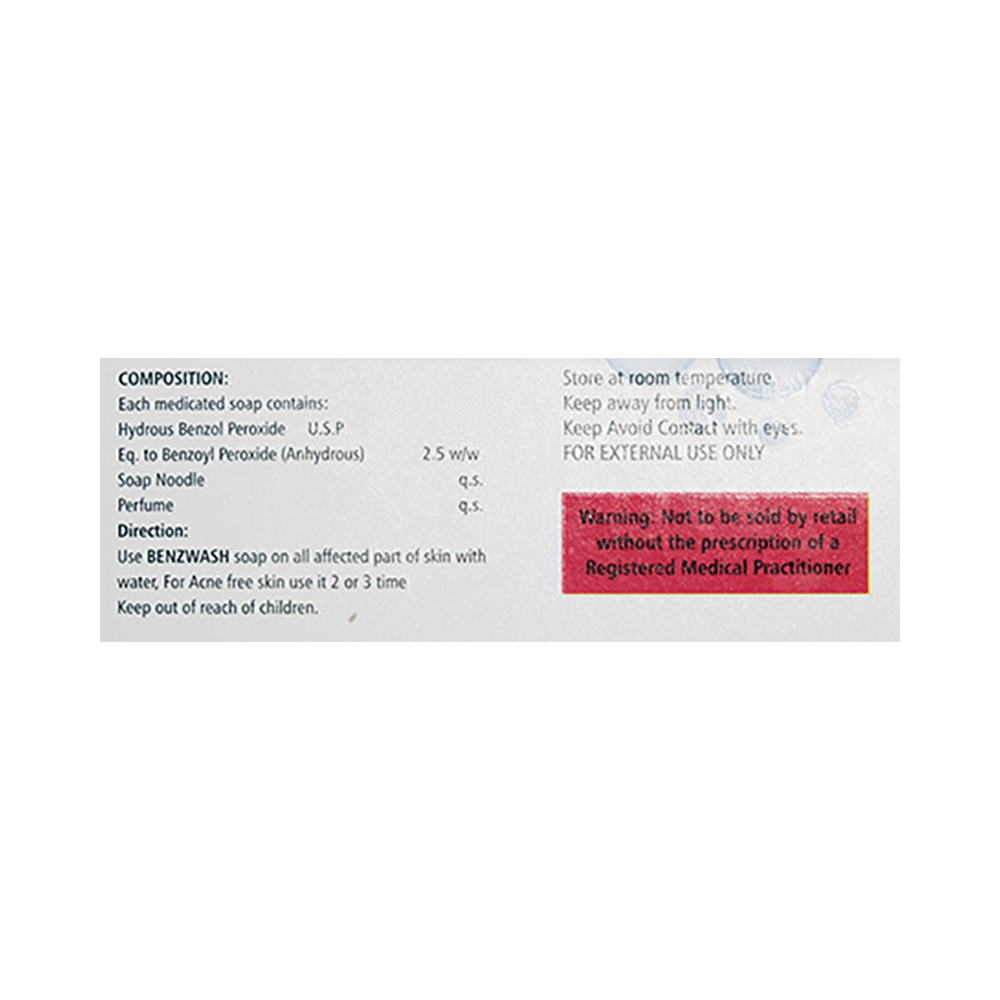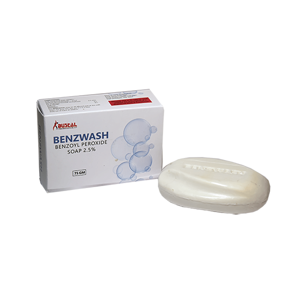 Benzwash Soap is an anti-bacterial medicine that helps treat acne. Acne appears as spots or pimples on your face, chest, or back. This medicine works by killing acne-causing bacteria. Benzwash Soap may be used alone or with other acne treatments. You should use it as advised by your doctor. Follow the instructions provided in the product leaflet to get the most out of this medicine. Wash and dry the affected area before medicine application. It is usually used once or twice a day. Do not apply it to damaged or broken skin and avoid contact with your mouth, eyes, and nose. It may take several weeks for your symptoms to improve, keep using it as advised. Consult your doctor after a month of regular use of this medicine, if your condition is not improving.Benzwash Soap has some common side effects including itching, stinging, peeling, and redness of the skin. They are not usually serious but tell your doctor if they bother you or do not go away. You may need to apply a smaller amount or use it less often. This medicine can make you more sensitive to sunlight. While using it, try to avoid exposure to too much sunlight. If this is unavoidable, apply the medicine in the evening. It can also bleach hair and fabrics including clothes so be careful to avoid contact with these.It is a safe medicine, but you should tell your doctor if you have other skin conditions and if you are using any other medicines, especially those applied to the skin. It may not be suitable if you have very sensitive skin. Ask your doctor about using this medicine if you are pregnant or breastfeeding.