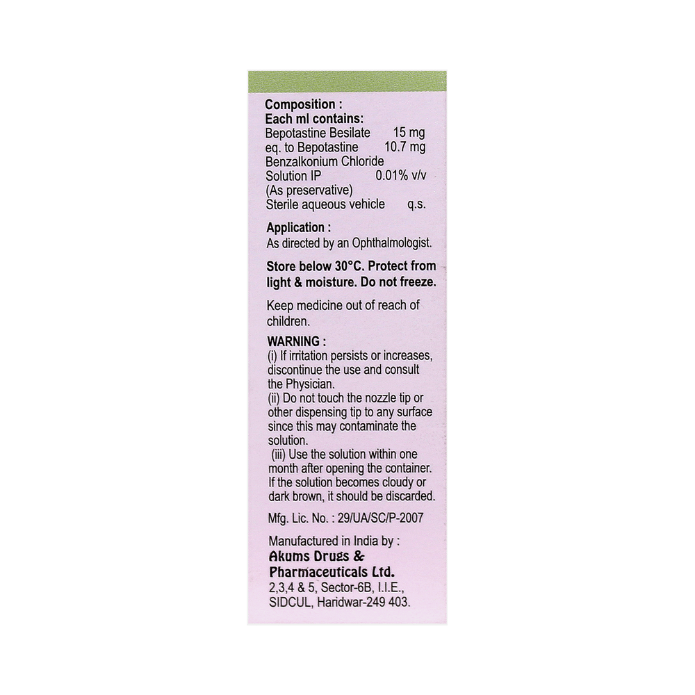 Beporite Eye Drop belongs to a group of medicines called antihistamines. It is used in the treatment of itching associated with inflammation in the eyes (redness and swelling) caused due to allergy. Follow your doctor’s instructions precisely for administering Beporite Eye Drop in the eye. It should be used regularly at evenly spaced time intervals as prescribed by your doctor. Do not skip any doses and finish the full course of treatment even if you feel better. Stopping the medicine too early may lead to returning or worsening.Commonly seen side effects seen with Beporite Eye Drop include eye irritation, headache, and nasopharyngitis. Consult your doctor if these side effects persist or if your condition worsens. It may cause blurring of your vision for a short time just after its use, so do not drive until your vision is clear.