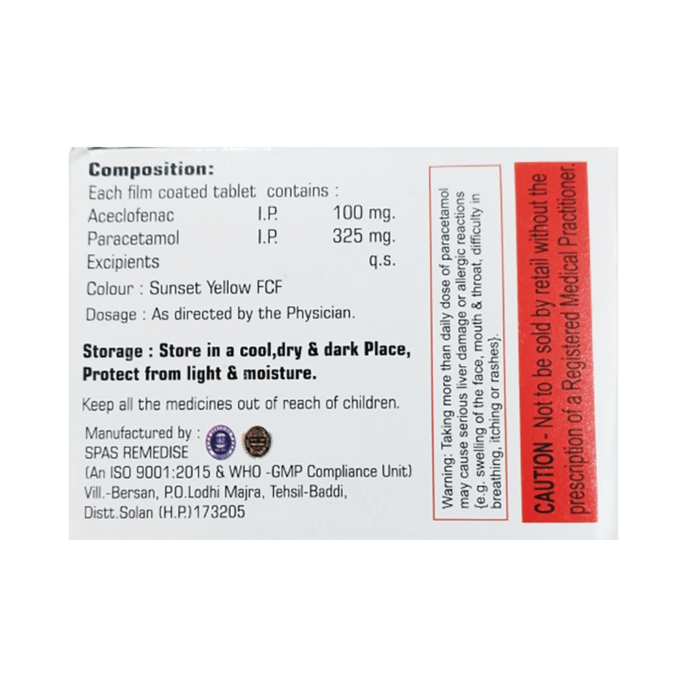 Salt Composition: Aceclofenac (100mg) + Paracetamol (325mg)