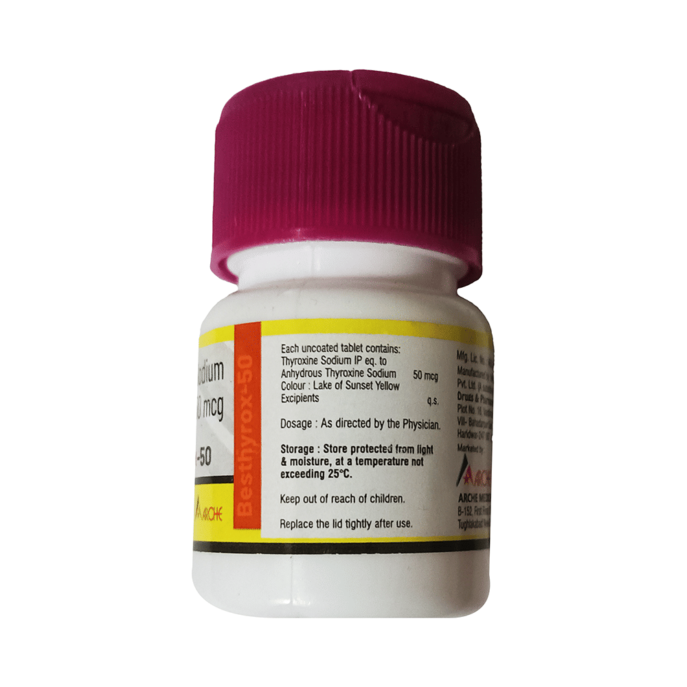 Besthyrox 50 Tablet is a medicine used to treat an underactive thyroid gland (hypothyroidism). It replaces the hormone which is not being produced by your thyroid gland in sufficient quantity and helps regulate your body’s energy and metabolism. Before you start taking Besthyrox 50 Tablet, your doctor will do a blood test to see what dose you need. Once you start taking the medicine, you will have regular blood tests to see how well it is working, and the dose may be adjusted from time to time. It is best taken on an empty stomach before your first meal of the day. You should take this medicine regularly to get the maximum benefit. It may take several weeks before your symptoms start to improve. You may need to take it for the rest of your life. If you stop taking it, your symptoms are likely to come back.The most common side effects of this medicine are caused by taking a higher dose than you need. Possible side effects include palpitations (irregular heartbeat), vomiting, anxiety, diarrhea, weight loss, tremors, increased appetite, and restlessness. Most side effects will disappear once you are on the right dose. Call your doctor straight away if you have a very high temperature, fast or irregular heart rate, low blood pressure, yellowness in the eye/skin, confusion, or fits.Besthyrox 50 Tablet may cause weight loss but should not be prescribed or taken to treat obesity. If you become pregnant while taking this medicine, inform your doctor right away as the dose may have to be increased/readjusted. Many other drugs affect the way this medicine works. Ask your doctor for advice if you are taking any other medications.