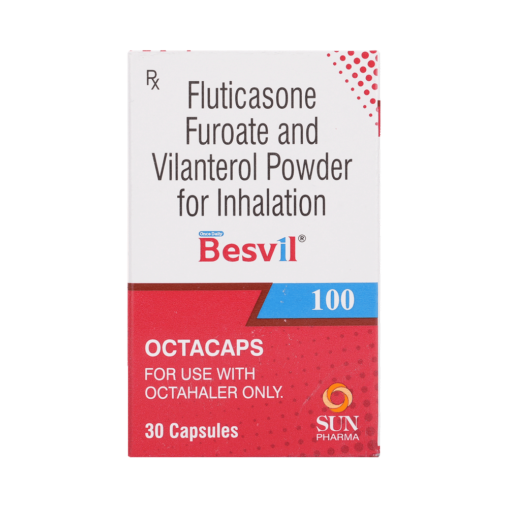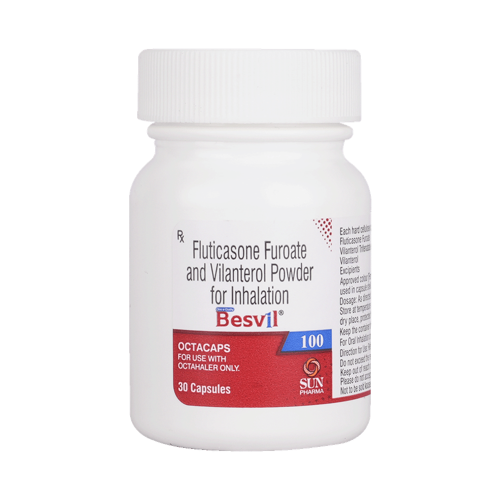 Besvil 100 Octacap is a combination of two medicines that opens the airways and makes it easier to breathe. It is used in the treatment of asthma (wheezing and shortness of breath) and chronic obstructive pulmonary disorder (a lung disorder in which the flow of air to the lungs is blocked). The effect of Besvil 100 Octacap may be noticeable after a few days but will only reach its maximum after a few weeks. This medicine must be used regularly for it to show its effect, so take it even if you don't have any symptoms. If you stop taking it before the prescribed duration, your asthma and chronic obstructive pulmonary disorder (COPD) may worsen. It should not be used to relieve sudden asthma attacks. If an asthma attack occurs, use your quick-relief inhaler (reliever). To get the most benefits from this medicine, make sure you get your inhaler technique right; otherwise, the medicine won’t work well.The most common side effects of Besvil 100 Octacap are nasopharyngitis, upper respiratory tract infection, headache, fever, back pain, pneumonia, sinusitis, and cough. You can prevent some of these symptoms by rinsing your mouth and throat with water or brushing your teeth after using your inhaler. There are other, rarer side effects that can be serious. Talk to your doctor if you're worried about them. In general, try to avoid situations which make your asthma worse (your triggers), and do not smoke.Ask your doctor whether it’s safe to take this medicine if you're pregnant or breastfeeding. Before taking it, tell your doctor if you have any kidney or liver diseases so that they can prescribe a suitable dose for you.