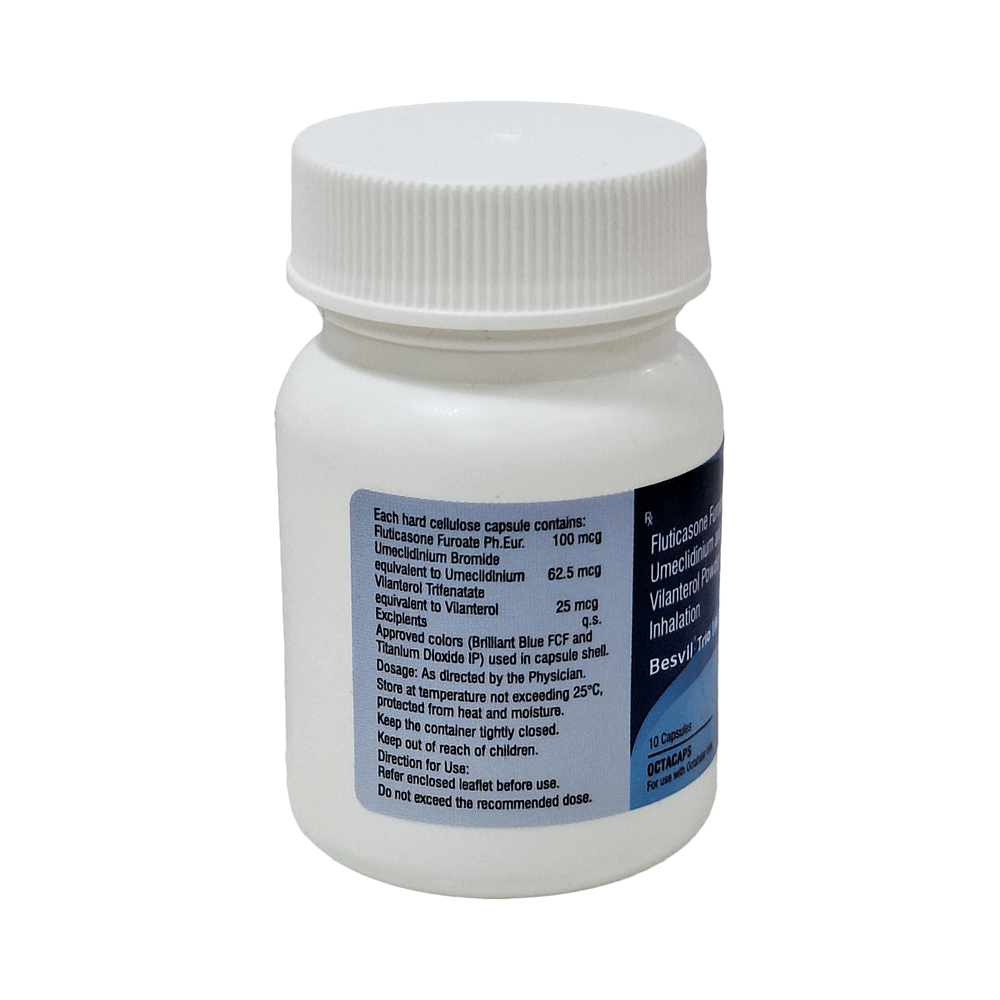 Besvil-Trio 100 Octacap is used in the treatment of chronic obstructive pulmonary disorder (COPD), a lung disorder in which the flow of air to the lung is blocked. It provides relief from COPD symptoms like wheezing, shortness of breath, coughing, and chest tightness. This medicine is for inhalation purposes only. Thus, it should not be taken by mouth. It is important to follow all the guidelines of the doctor before using it. Before using the medicine, the doctor will guide you on how to use this medicine. Use it in the dose and duration advised by the doctor.Common cold is the most common side effect of this medicine. You may also experience side effects like fungal infection of the mouth, infection of the nose, blocked nose, cough, and headache. If any of these side effects persist or get worse, you should let your doctor know.Do not use this medicine without consulting the doctor if you have any problems related to heart, liver, or if you have glaucoma, tuberculosis (TB), asthma, and enlarged prostate.
